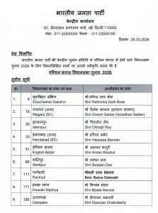 भारतीय जनता पार्टी ने 25 मार्च को पश्चिम बंगाल विधानसभा चुनाव 2026 (West Bengal Assembly Election) के लिए उम्मीदवारों की तीसरी सूची जारी कर दी है। केंद्रीय चुनाव समिति ने 19 उम्मीदवारों के नामों को मंजूरी दी है। कूचबिहार दक्षिण से रथिन्द्र नाथ बोस को टिकट दिया गया है। राजगंज से दिनेश सरकार और इस्लामपुर से चित्रजीत राय चुनाव लड़ेंगे।