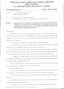 The Election Commission has issued orders banning motorcycles between 6 PM and 6 AM starting two days before polling, with pillion riders prohibited even during the relaxation window of 6 AM to 6 PM.