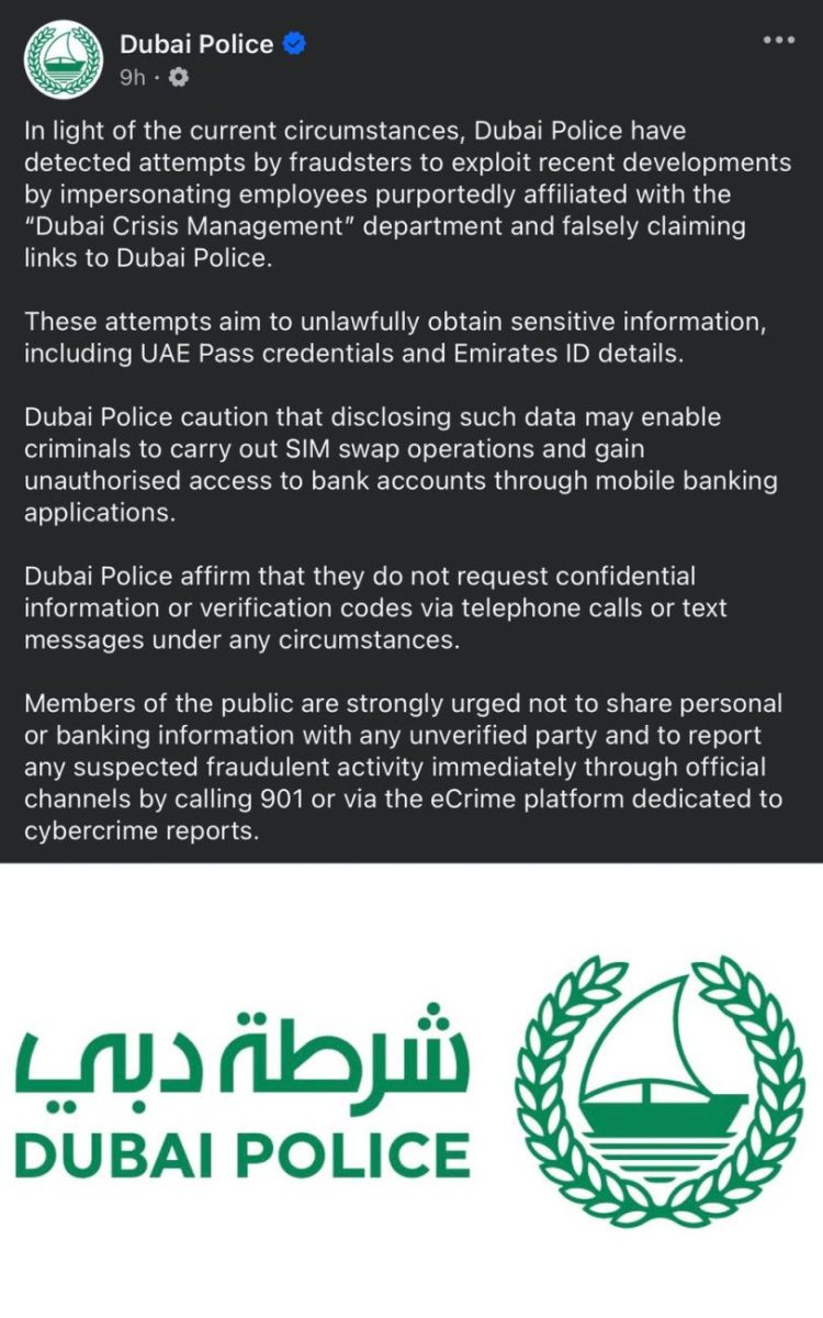 एक तरफ जहां लोग सुरक्षा अलर्ट को लेकर दहशत में हैं, वहीं दूसरी ओर साइबर अपराधियों ने इस स्थिति का फायदा उठाना शुरू कर दिया है। दुबई पुलिस ने एक आधिकारिक एडवाइजरी जारी कर नागरिकों को सतर्क किया है। एडवाइजरी के मुताबिक, कुछ जालसाज खुद को “दुबई क्राइसिस मैनेजमेंट” का कर्मचारी बताकर लोगों को फोन कर रहे हैं।