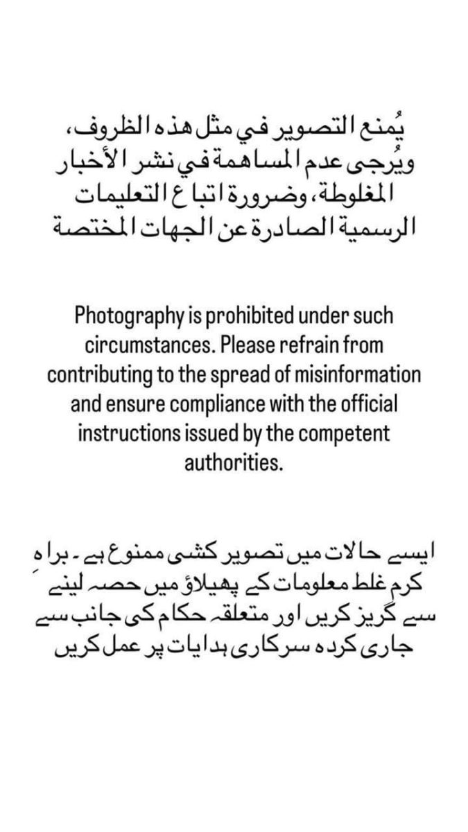 इस संवेदनशील माहौल में किसी भी तरह की अफवाह या गलत सूचना को फैलने से रोकने के लिए स्थानीय प्रशासन ने बेहद कड़े कदम उठाए हैं। दुबई से मिली जानकारी के मुताबिक, अरबी, अंग्रेजी और उर्दू में एक आधिकारिक सूचना जारी की गई है, जिसमें स्पष्ट रूप से कहा गया है कि मौजूदा परिस्थितियों में किसी भी प्रकार की तस्वीर खींचने या वीडियो बनाने पर पूरी तरह से पाबंदी है। सरकार ने लोगों से अपील की है कि वे सोशल मीडिया पर अपुष्ट जानकारी न फैलाएं और केवल सरकारी एजेंसियों द्वारा दिए गए निर्देशों का ही पालन करें।