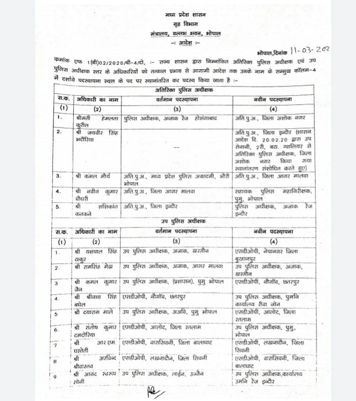 भोपाल। मध्यप्रदेश सरकार के गृह विभाग ने राज्य शासन के अतिरिक्त पुलिस अधीक्षक एवं उप पुलिस अधीक्षकों का स्थानांतरण आदेश जारी किया।