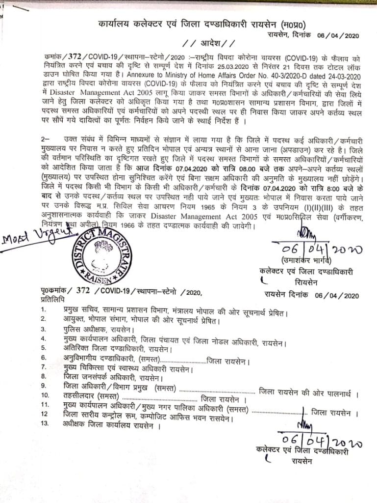 नोवेल कोरोना वायरस कोविड-19 संक्रमण से बचाव एवं नियंत्रण के लिए तथा जिले की वर्तमान परिस्थितियों को देखते हुए कलेक्टर एवं जिला दण्डाधिकारी उमाशंकर भार्गव ने जिले में पदस्थ सभी विभागों के अधिकारियों, कर्मचारियों को 07 अप्रैल 2020 को रात्रि 8 बजे तक अपने-अपने मुख्यालयों पर उपस्थित होने के आदेश दिए हैं। साथ ही बिना सक्षम अधिकारी की अनुमति के मुख्यालय नहीं छोड़ने के आदेश भी दिए गए हैं। जिले में पदस्थ किसी भी विभाग के अधिकारी, कर्मचारी के 07 अप्रैल को रात्रि 8 बजे के बाद से उनके पदस्थ/कर्तव्य स्थल पर उपस्थित नहीं पाए जाने एवं मुख्यतः भोपाल में निवास करता पाए जाने पर उनके विरूद्ध नियमानुसार अनुशासनात्मक तथा दण्डात्मक कार्यवाही की जाएगी।