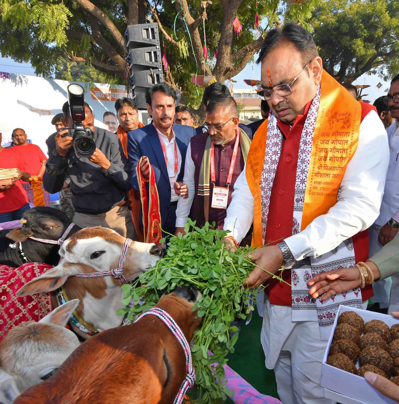 मुख्यमंत्री भजनलाल शर्मा ने जन्मदिन और राज्य सरकार के 2 वर्ष पूर्ण होने के उपलक्ष्य पर जयपुर स्थित पिंजरापोल गौशाला में सोमवार को गोसेवा की। उन्होंने सपत्नीक गायों की पूजा अर्चना कर गुड़ एवं चारा खिलाया। उन्होंने इस अवसर पर हवन में आहुति भी दी। उन्होंने कहा कि गोसेवा हमारी सनातन संस्कृति और परंपरा का अभिन्न हिस्सा है तथा राज्य सरकार गौवंश के संरक्षण एवं संवर्धन के लिए निरंतर कार्य कर रही है।