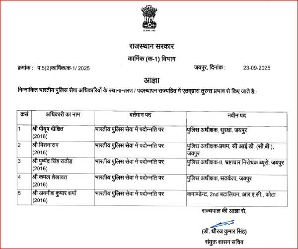 Rajasthan IPS Transfer : राजस्थान में इन दिनों प्रशासनिक फेरबदल का दौर लगातार जारी है। आईएएस-आईपीएस और आरएएस के बाद राज्य की भजनलाल सरकार ने आज मंगलवार को फिर 5 भारतीय पुलिस सेवा (IPS) अधिकारियों के तबादले किए हैं। इस संबंध में कार्मिक विभाग ने आदेश भी जारी कर दिए है। खास बात ये है कि ये सभी अधिकारी हाल ही में आईपीएस सेवा में पदोन्नत हुए है और सभी 2016 बैच से हैं। इन्हें राज्य के अलग-अलग जिलों और विभागों में महत्वपूर्ण जिम्मेदारियां सौंपी गई हैं।