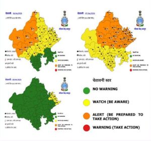 - येलो अलर्ट: श्रीगंगानगर, हनुमानगढ़, बाडमेर, चूरू, टॉक, झुंझुनू, अलवर, भरतपुर, करौली, बूंदी, कोटा, सवाईमाधोपुर जिले और आसपास के क्षेत्रों में अलग-अलग स्थानों पर मेघगर्जन के साथ हल्की से मध्यम वर्षा / आकाशीय बिजली / ओलावृष्टि और कहीं- कहीं पर तेज़ हवा (20-30 kmph) चलने की संभावना है।