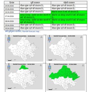 मौसम विभाग ने पश्चिमी विक्षोभ के असर से 25 से 28 अप्रैल तक बादल बारिश की स्थिति बनी रहने की संभावना जताई है। इसका असर बीकानेर, जयपुर, भरतपुर, जोधपुर और अजमेर संभाग में बना रहेगा। हालांकि आगामी दिनों में अधिकतम तापमान में औ 1-2 डिग्री सेल्सियस बढ़ोतरी होने तथा आगामी 3-4 दिन पश्चिमी व उत्तर-पूर्वी भागों में कहीं-कहीं हीटवे चलने की संभावना है। इस दौरान राज्य के उत्तर पश्चिमी भागों में कहीं-कहीं अधिकतम तापमान 44 से 45 डिग्री पहुंचने का अनुमान है।