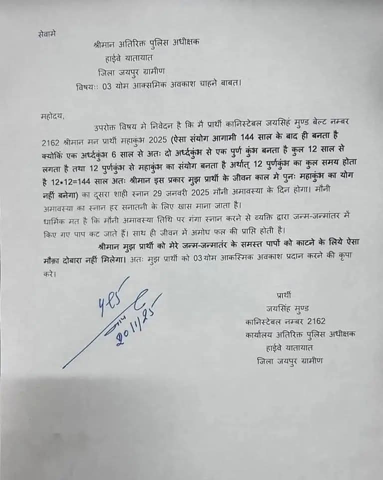 ये पत्र राजस्थान पुलिस के एक कांस्टेबल का है जिसने अतिरिक्त पुलिस अधीक्षक को महाकुंभ स्नान करने के लिए छुट्टी का आवेदन पत्र सौंपा है, ये पत्र कार्यालय अतिरिक्त पुलिस अधीक्षक हाईवे यातायात जिला जयपुर ग्रामीण में पदस्थ कांस्टेबल जयसिंह मुण्ड ने लिखा है।