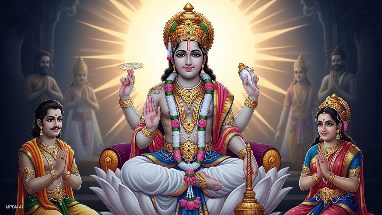 - अंत में आपको भगवान को पान, चरणामृत, रोली, कुमकुम, फल, फूल, तिल जैसी चीज अर्पित करना है। कथा के बाद आरती करें और सभी लोगों में प्रसाद वितरित करें।
