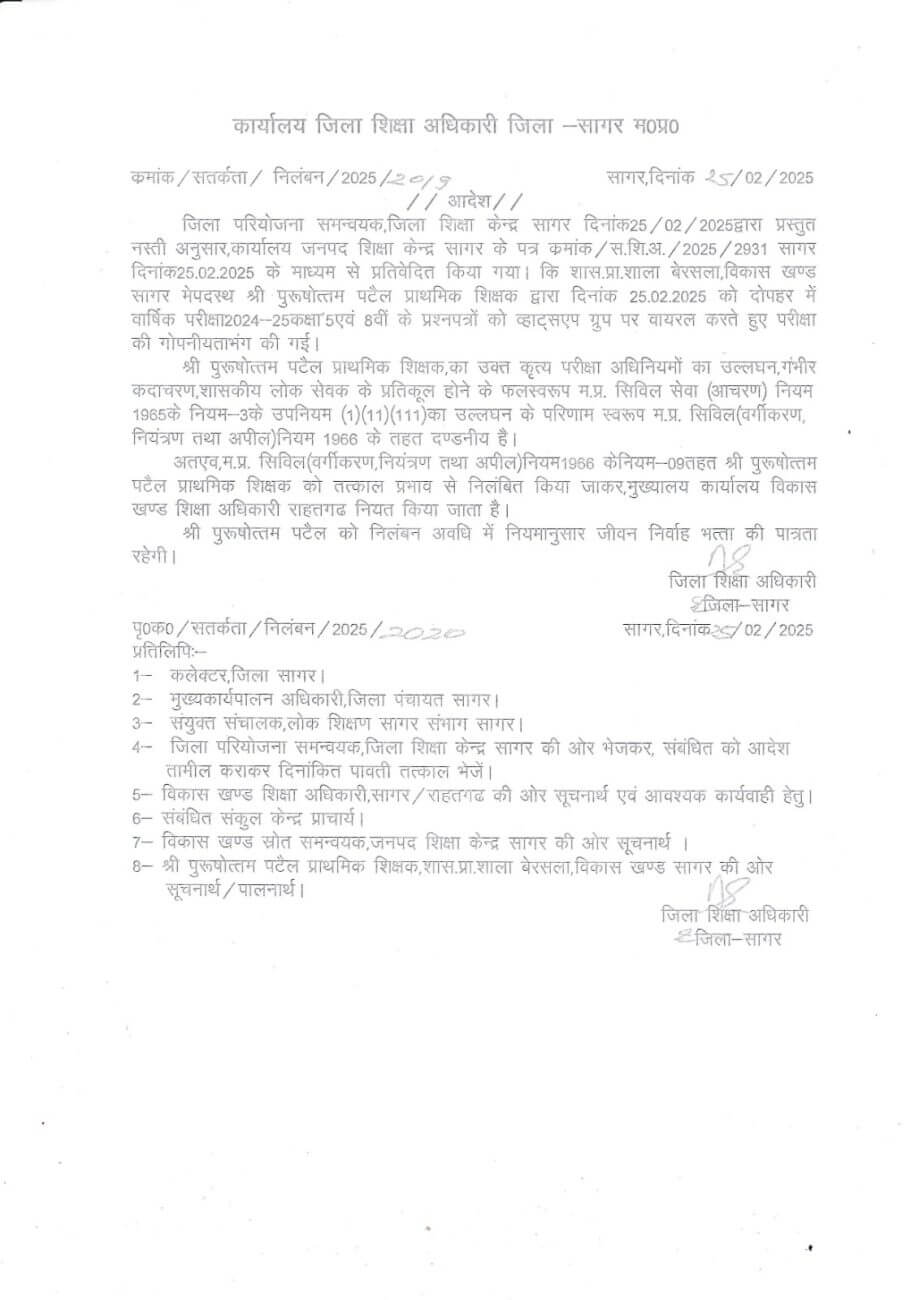अपने आदेश में DEO ने लिखा – जिला परियोजना समन्वयक, जिला शिक्षा केन्द्र सागर ने एक प्रतिवेदित किया है कि शासकीय प्राथमिक शाला बेरसला, विकास खण्ड सागर में पदस्थ पुरुषोत्तम पटेल प्राथमिक शिक्षक द्वारा 25 फरवरी को दोपहर में वार्षिक परीक्षा 2024-25 कक्षा 5 एवं 8वीं के प्रश्नपत्रों को व्हाट्सएप ग्रुप पर वायरल करते हुए परीक्षा की गोपनीयताभंग की गई। ये एक अपराध है इसलिए प्राथमिक शिक्षक को तत्काल प्रभाव से निलंबित कर उन्हें कार्यालय विकास खण्ड शिक्षा अधिकारी राहतगढ पदस्थ किया जाता है।
