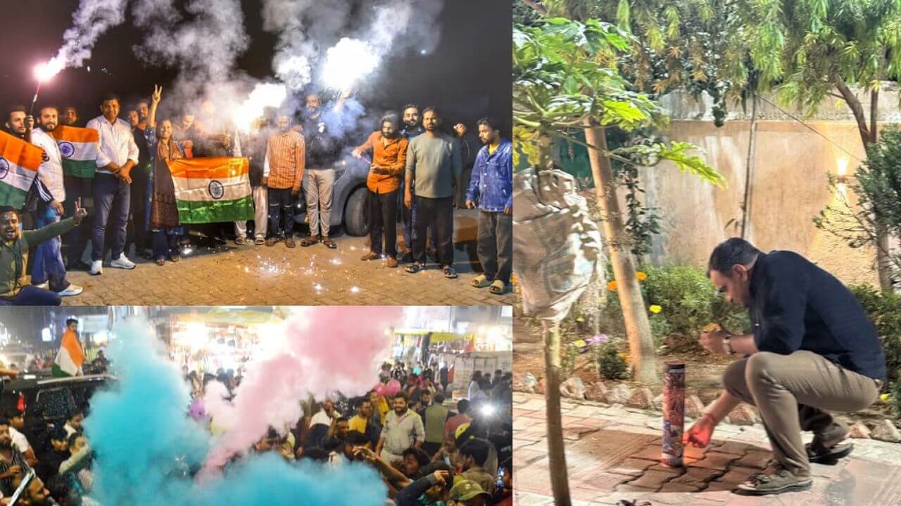 युवा से लेकर बुजुर्ग तक भारत की ऐतिहासिक जीत का जश्न मनाते हुए नजर आए। आसमान में आतिशबाजी की गई, जिससे माहौल खुशनुमा और रंगीन हो गया।