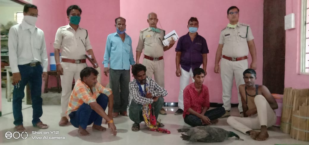 मई माह की गर्मी के चलते जंगली जानवर इन दिनो जंगल मे पानी न होने के कारण रहवासी क्षेत्र की ओर बढ़ रहे है। जिसका फायदा शिकारी उठा रहे है। वन प्राणी की सुरक्षा के लिए जहां वनविभाग की टीम गश्त कर रही है वहीं ग्रामवासियों मे भी जागरूकता आ गई है। जिसका परिणाम यह निकला कि ग्रामीणों की मदद से मोर का शिकार कर रहे है चार शिकारियो को वनविभाग की टीम ने मोर सहित गिरफ्तार किया है।