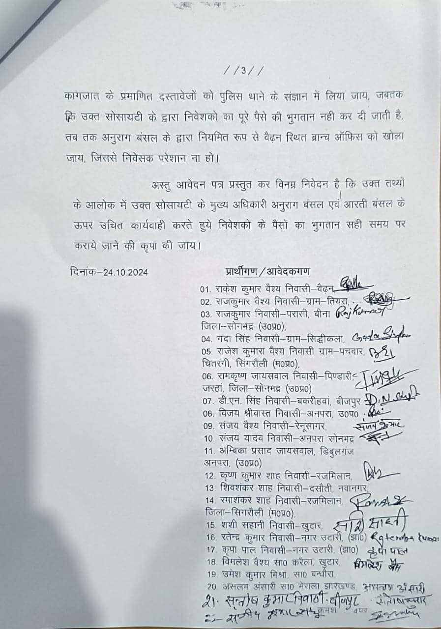 कंपनी की एजेंट राजकुमार बैस ने आरोप लगाया कि आरती बंसल और अनुराग बंसल पहले ऑप्शन नाम की चिटफंड कंपनी में लोगों का निवेश कराया। कुछ दिनों बाद यह लोग कंपनी का नाम बदल दिए। यह लोग दूसरी बार स्वामी विवेकानंद मल्टी स्टेट को-ऑपरेटिव सोसायटी से लोगों से निवेश कराने लगे। कंपनी के कर्ताधर्ता अनुराग बंसल ने लोगों को कम समय में पैसे डबल कराने की गारंटी ली। हजारों लोगों को एडवाइजर बनकर 100 करोड़ रुपए से ज्यादा का निवेश कराया। इस दौरान बैस ने कहा कि मेरा खुद का करीब 2 करोड़ रुपए और मेरी टीम का 7 से 8 करोड़ रुपए कंपनी में जमा है, लेकिन पिछले कुछ दिनों से कलेक्टर के आदेश के बाद कंपनी बंद हो गई।