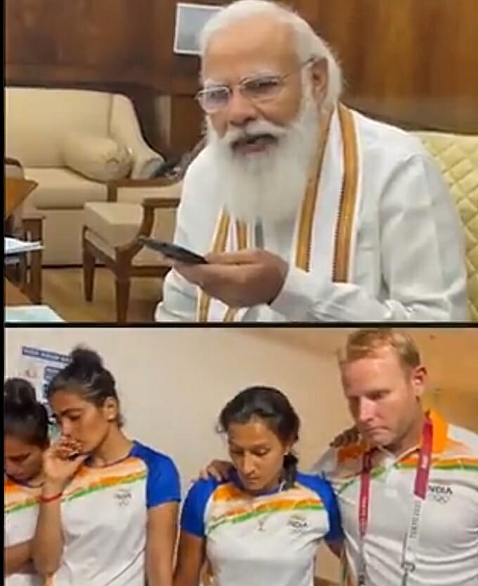 पीएम मोदी ने कहा कई कई दशकों के बाद आप लोगों की मेहनत से हॉकी की पहचान एक बार फिर पुनर्जीवित हो रही है..ये बात उन्होने भावुक हुई टीम की खिलाड़ियों का हौंसला बढ़ाते हुए कही। पीएम मोदी ने कहा कि आपका पसीना पदक नहीं ला सका, लेकिन वो देश की करोड़ों बेटियों की प्रेरणा बन गया है। पीएम मोदी ने टीम के सभी सदस्यों को और कोच को बधाई देते हुए कहा कि उनपर पूरे देश को नाज है। बातचीत के दौरान प्रधानमंत्री ने नवनीत की चोट का जिक्र करते हुए उनका हालचाल भी जाना। इसी के साथ उन्होंने वंदना कटारिया और सलीमा के खेल की भी सराहना किया। बातचीत के अंत में उन्होने कोच से बात करते हुए उन्हें भी खिलाड़ियों का हौंसला बढ़ाने के लिए कहा।