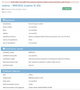 यह स्मार्टफोन एंड्रॉयड 12 पर आधारित होगा। Realme 9i 5G में 8 जीबी रैम और 128 जीबी इंटर्नल स्टोरेज दिया गया है। हाल ही में Realme 9i 5G को NTBC सर्टिफिकेशन वेबसाईट पर भी देखा गया है। रिपोर्ट की माने स्मार्टफोन 5,000mAh की बैटरी और 18W फास्ट चार्जिंग के साथ आएगा। Realme 9i 5G की कीमत 15,000 रुपये के आसपास बताई जा रही है।