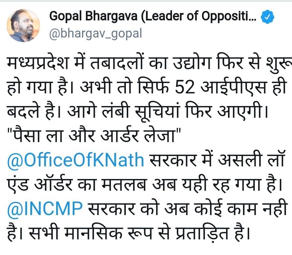 भोपाल। प्रदेश में प्रशासनिक फेरबदल के बाद अब ट्वीटवार शुरू हो गया है। नेता प्रतिपक्ष गोपाल भार्गव ने ट्वीट कर सरकार पर निशाना साधा है। कमलनाथ सरकार पर तबादला उद्योग चलाने का आरोप लगाया है। उन्होंने कहा की आगे लंबी सूचियाँ आएंगी, पैसा ला और ऑर्डर लेजा। सरकार में असली लॉ एंड आर्डर यही रह गया है ये नेता प्रतिपक्ष गोपाल भार्गव ने ट्वीट कर कमलनाथ सरकार पर निशाना साधा है।