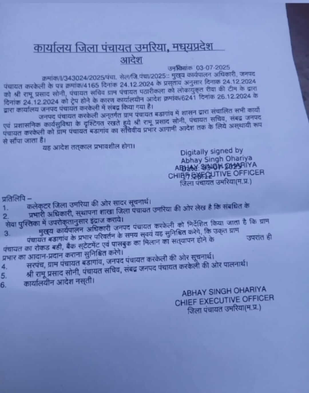 उमरिया में एक घूसखोर पंचायत सचिव को फिर से ग्राम पंचायत में सचिव बनाकर भेजने से जिला पंचायत के सीईओ अभय सिंह ओहरिया सुर्खियों में आ गए है, घूसखोर सचिव को फिर से पंचायत की जिम्मेदारी दिए जाने पर कांग्रेस एन सवाल उठाये हैं, कांग्रेस ने इसकी जाँच की मांग की है।