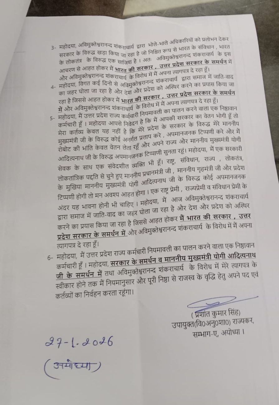 लखनऊ: उत्तर प्रदेश के अयोध्या में एक बड़े प्रशासनिक फेरबदल की खबर सामने आई है। यहां तैनात वाणिज्य कर विभाग (GST) के डिप्टी कमिश्नर प्रशांत कुमार सिंह ने अपने पद से इस्तीफा दे दिया है। उन्होंने अपना त्यागपत्र सीधे राज्यपाल को भेजा है, जिसमें शंकराचार्य अविमुक्तेश्वरानंद द्वारा मुख्यमंत्री योगी आदित्यनाथ पर की गई कथित अभद्र टिप्पणियों को इस्तीफे की वजह बताया है।