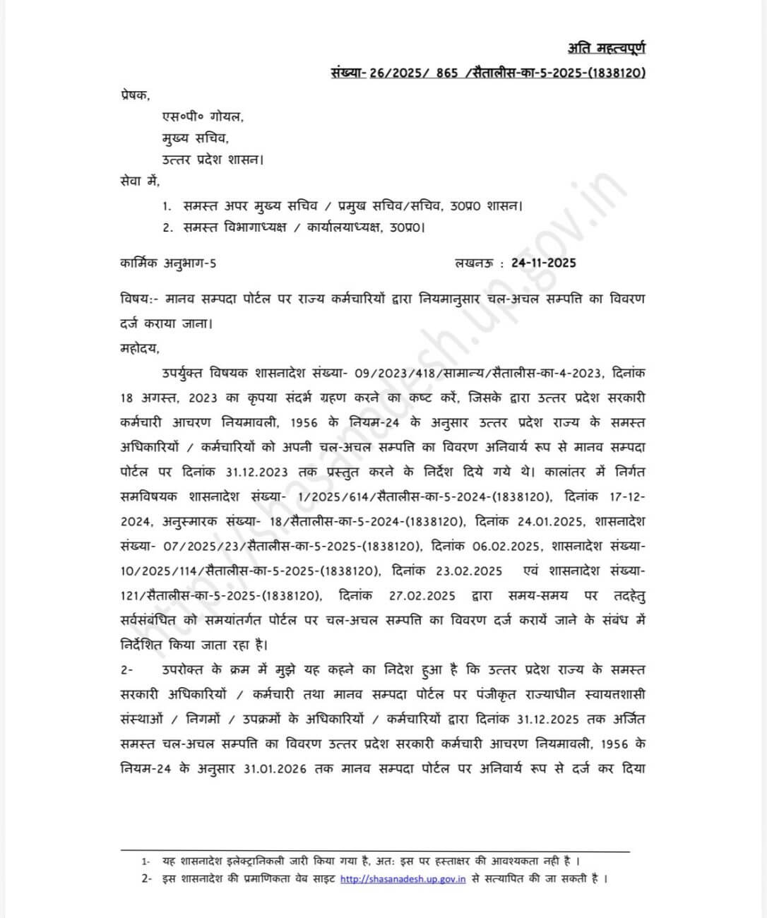 UP Employees News : उत्तर प्रदेश के अधिकारियों-कर्मचारियों के लिए महत्वपूर्ण खबर है।राज्य की योगी आदित्यनाथ सरकार ने कर्मचारियों को अपनी चल-अचल संपत्ति का विवरण मानव संपदा पोर्टल पर दर्ज करने के लिए 31 जनवरी 2026 तक का समय दिया है।इसे लेकर मुख्य सचिव एसपी गोयल ने आदेश भी जारी कर दिए है।ध्यान रहे समय पर विवरण न देने वाले अधिकारियों व कर्मचारियों की पदोन्नति पर विचार नहीं होगा।इसके अलावा प्रतिनियुक्ति या अन्य काडर के प्रकरणों पर भी विचार नहीं किया जाएगा।