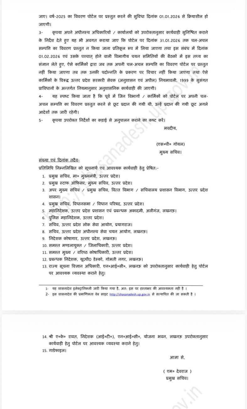 दरअसल, राज्य के मुख्य सचिव एसपी गोयल ने आदेश जारी किया है कि 31 जनवरी 2026 तक अपनी चल-अचल संपत्ति का पूरा विवरण ऑनलाइन पोर्टल पर अपलोड करना सभी सरकारी अधिकारियों और कर्मचारियों के लिए अनिवार्य होगा। इस तारीख तक विवरण जमा न करने वालों के नाम 1 फरवरी 2026 से शुरू होने वाली किसी भी पदोन्नति प्रक्रिया में शामिल नहीं किए जाएंगे औरविभागीय कार्रवाई भी शुरू हो सकती है।बता दे कि उत्तर प्रदेश लोक सेवकों (सेवा में रहते हुए चल-अचल संपत्ति अर्जन) नियमावली के तहत प्रत्येक सरकारी कर्मचारी को हर वर्ष 31 जनवरी तक अपनी और परिवार के सदस्यों की संपत्ति का पूरा ब्यौरा देना होता है।