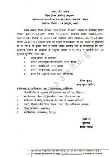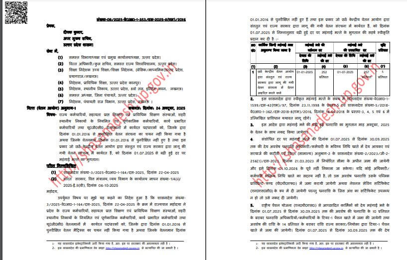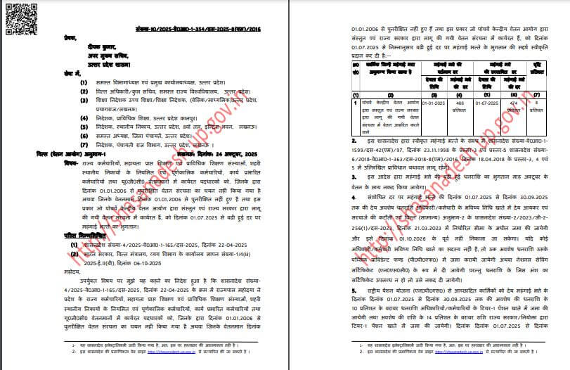 5th 6th Pay Commission DA Hike 2025 : उत्तर प्रदेश के सरकारी कर्मचारियों और पेंशनरों के लिए खुशखबरी है।7वें वेतनमान के बाद अब राज्य की योगी आदित्यनाथ सरकार ने 5वें और छठे वेतन आयोग के तहत कार्यरत कर्मचारियों का महंगाई भत्ता बढ़ाया है। यह वृद्धि 1 जुलाई 2025 से लागू होगी, ऐसे में जुलाई अगस्त और सितंबर महीने का एरियर भी मिलेगा। बढ़े हुए डीए का लाभ अक्टूबर की सैलरी में नवंबर में दिया जाएगा। इस संबंध में वित्त विभाग ने आदेश भी जारी कर दिए है।इसके अलावा प्रदेश में तैनात अखिल भारतीय सेवा (IAS, IPS, IFS) के अधिकारियों के महंगाई भत्ते में वृद्धि के आदेश भी जारी किए गए हैं।