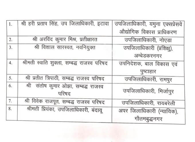 - इटावा के उप जिलाधिकारी हरी प्रताप सिंह को यमुना एक्सप्रेस वे औद्योगिक विकास प्राधिकरण का उप जिलाधिकारी ।