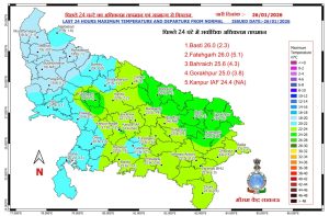 - 28 जनवरी को पूर्वी व पश्चिमी उत्तर प्रदेश में कुछ स्थानों पर मेघगर्जन के साथ बारिश की संभावना है। इस दौरान झोंकेदार हवा की गति 30 से 50 किमी/घंटा रह सकती है। इस दौरान अधिकतम और न्यूनतम तापमान में उतार-चढ़ाव देखने को मिलेगा। मध्य और पूर्वी यूपी कहीं-कहीं तेज बारिश और ओले गिरने के भी आसार हैं।