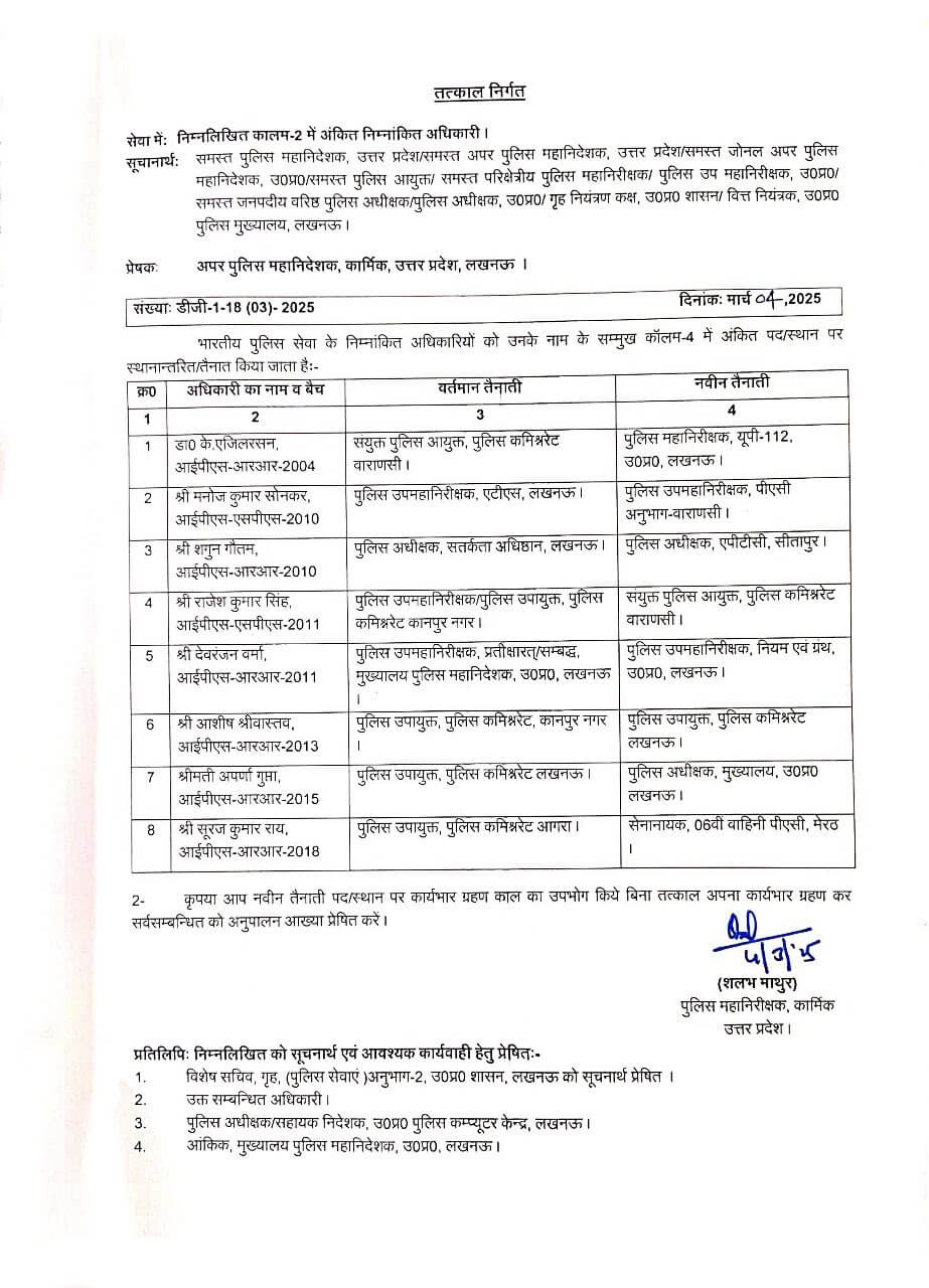 आदेश के तहत आईपीएस मनोज सोनकर को डीआईजी एटीएस के पद से हटा कर डीआईजी पीएसी वाराणसी और आईपीएस राजेश कुमार सिंह को कानपुर कमिश्नरी से हटाकर जॉइंट पुलिस कमिश्नर वाराणसी भेजा गया है।आईपीएस देवरंजन वर्मा को डीआई रूल्स एंड मैन्युअल बनाया गया है.