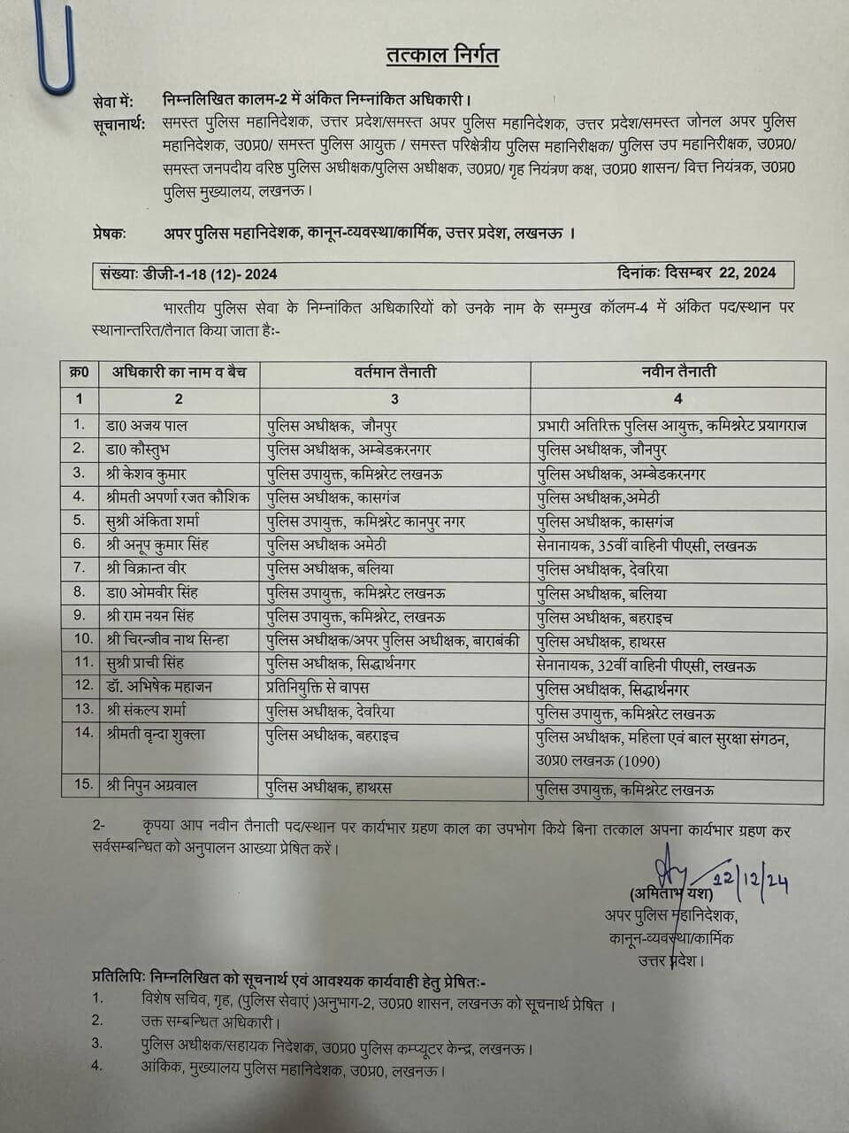 - हाथरस के पुलिस अधीक्षक निपुन अग्रवाल को लखनऊ का पुलिस अयुक्त ।