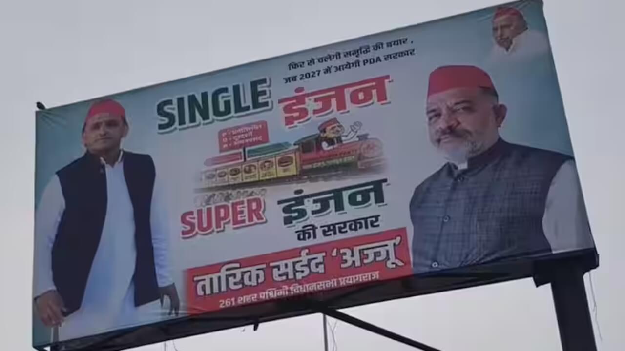 प्रयागराज के कानपुर हाईवे पर इलाहाबाद हाईकोर्ट के पास लगे इस होर्डिंग में बीजेपी की ‘डबल इंजन सरकार’ को सपा नेता ने खुली चुनौती दी है। सपा नेता ने अखिलेश यादव को ‘सिंगल इंजन’ और ‘सुपर इंजन’ की सरकार का चेहरा बताया है। पोस्टर के शीर्ष पर सपा संस्थापक मुलायम सिंह यादव की तस्वीर लगाई गई है, जबकि उसके नीचे अखिलेश यादव और खुद तारिक सईद अज्जू की तस्वीरें हैं। इस पोस्टर का मकसद सपा की ताकत और अखिलेश यादव की लोकप्रियता को उजागर करना बताया जा रहा है।