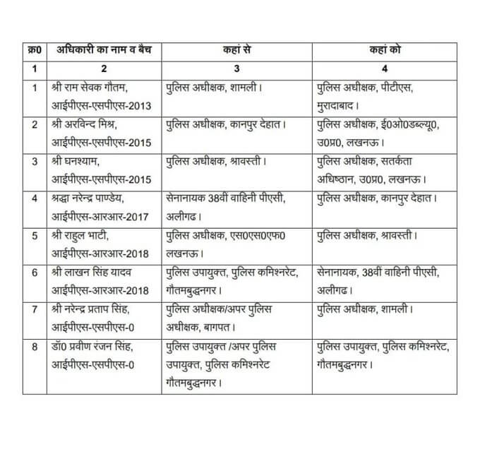 - श्रद्धा नरेंद्र पांडेय को सेनानायक 38वीं वाहिनी पीएसी, अलीगढ़ से पुलिस अधीक्षक, कानपुर देहात