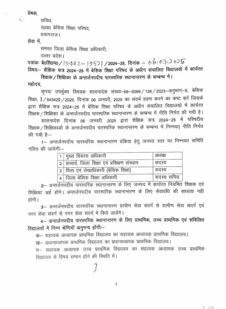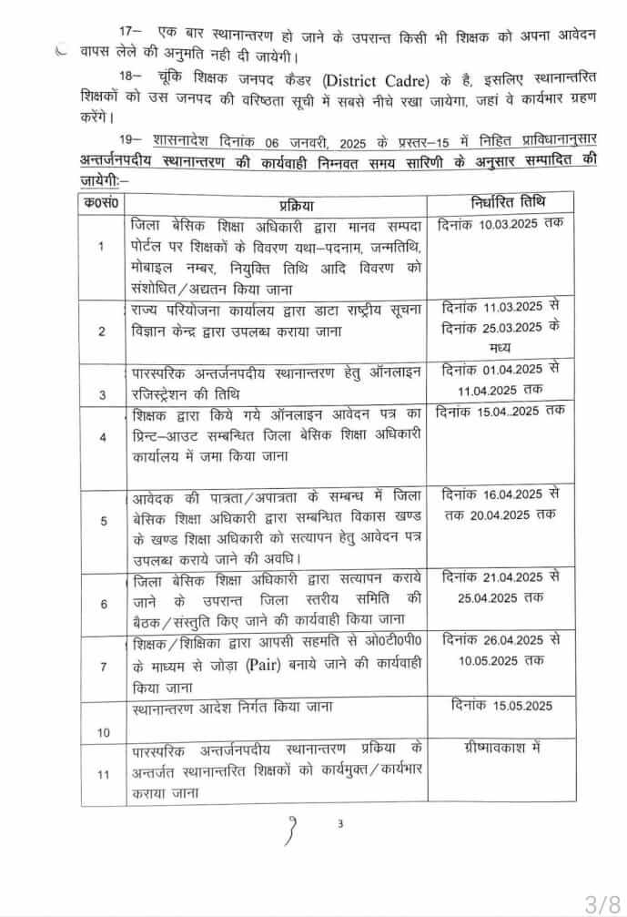 - 1 अप्रैल से 11 अप्रैल तक पारस्परिक अंतर्जनपदीय स्थानांतरण के लिए ऑनलाइन पंजीकरण की प्रक्रिया पूरी होगी।