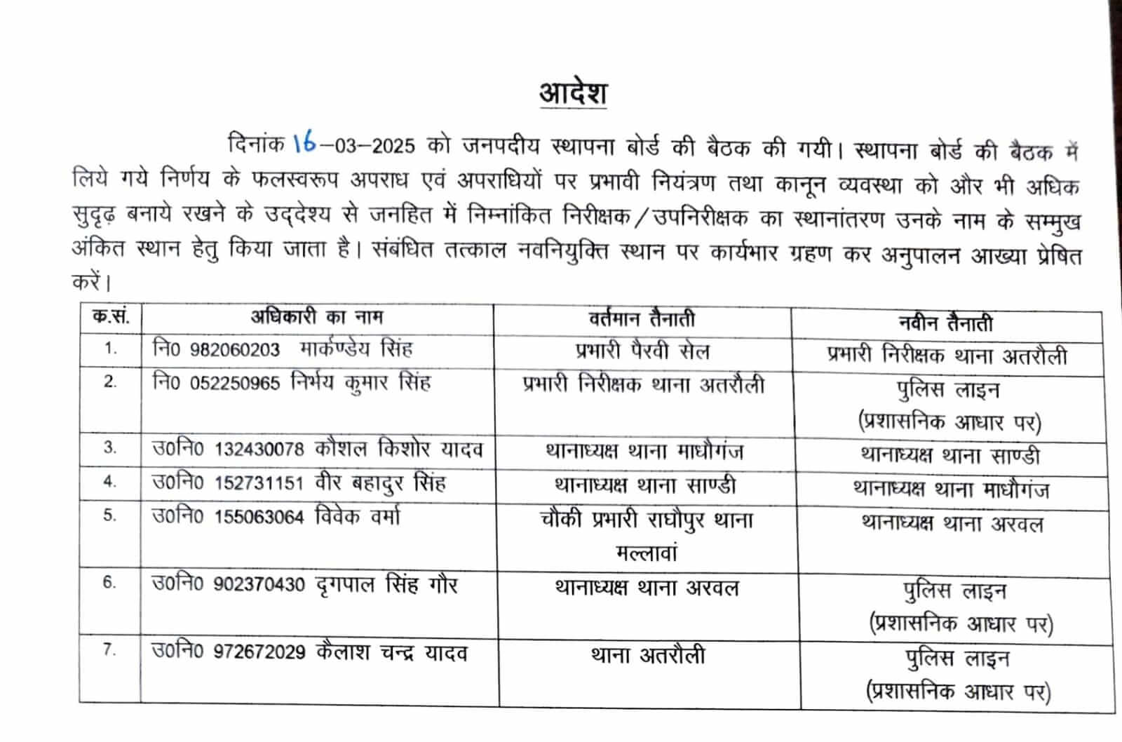 - निरीक्षक निर्भय कुमार सिंह को अतरौली से पुलिस लाइन।