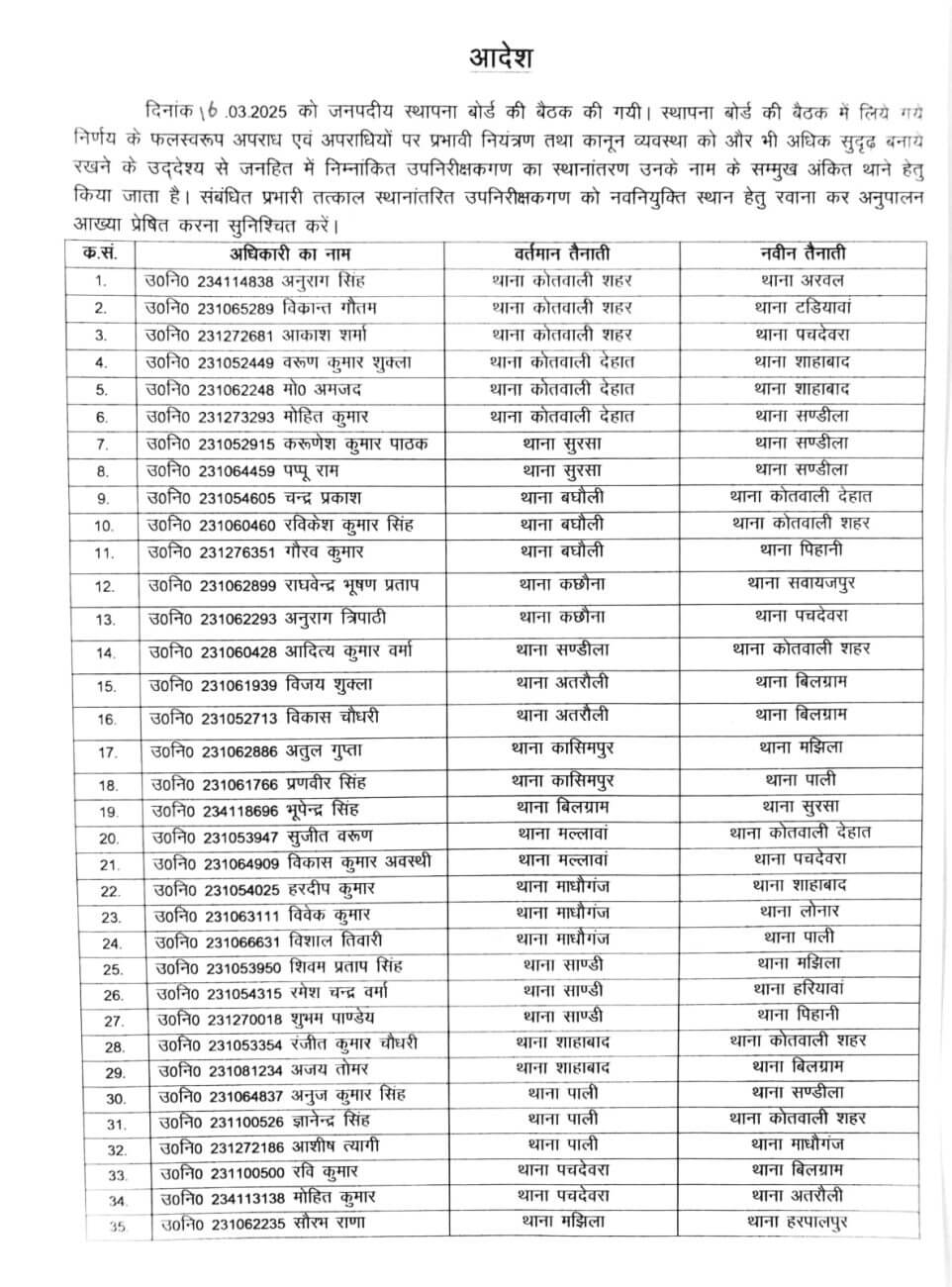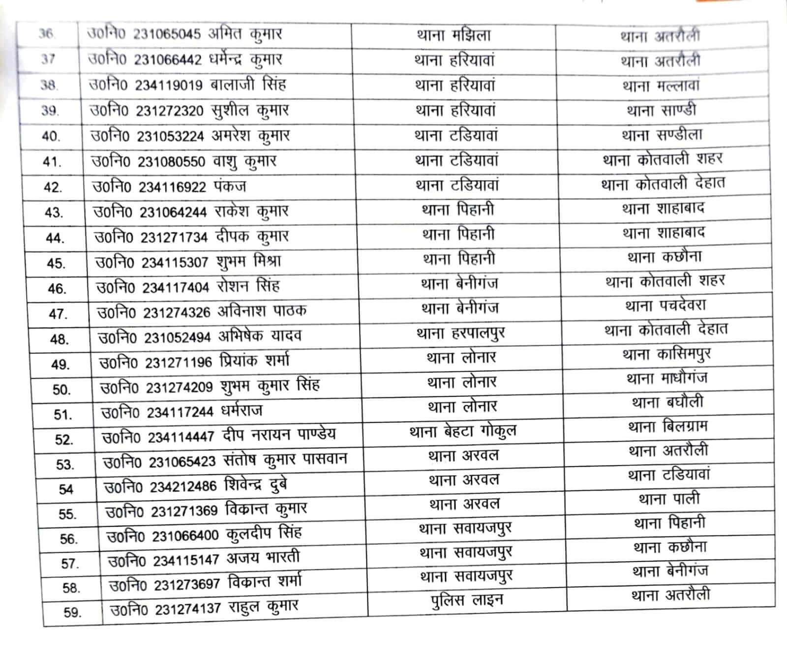 - उपनिरीक्षक भूपेन्द्र सिंह को बिलग्राम से सुरसा, रंजीत कुमार चौधरी को शाहाबाद से कोतवाली शहर और अजय तोमर को शाहाबाद से बिलग्राम ।
