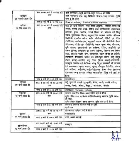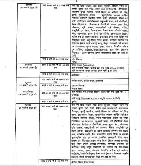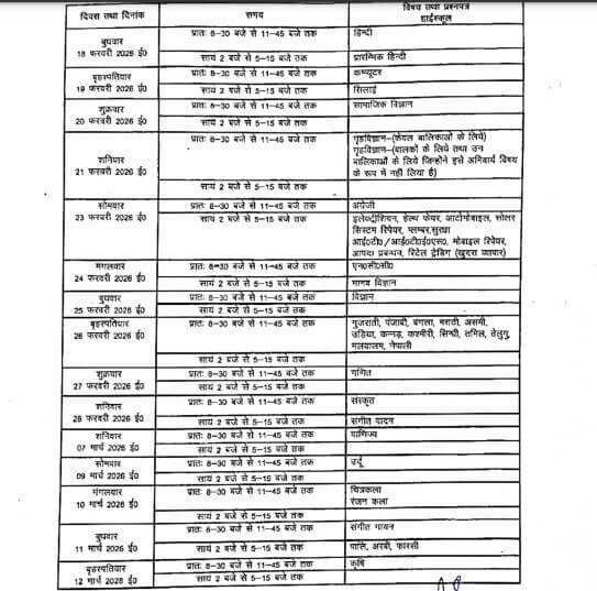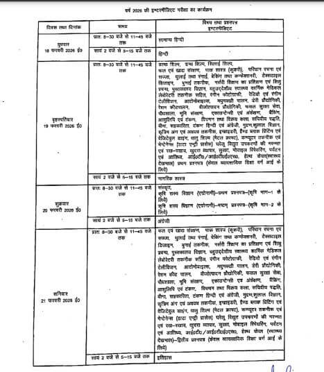 हाईस्कूल की परीक्षा की शुरुआत 18 फरवरी से हिंदी एवं प्रारंभिक हिंदी के पेपर के साथ होगी। अंग्रेजी की परीक्षा 23 फरवरी ,विज्ञान 25 और गणित की 27 फरवरी को होगी। इंटरमीडिएट की परीक्षा 18 फरवरी को हिंदी से शुरू होगी। इसके बाद अंग्रेजी की परीक्षा 20 फरवरी ,इतिहास 21 फरवरी,जीव विज्ञान एवं गणित की परीक्षा 23 फरवरी ,अर्थशास्त्र 24 फरवरी, रसायन विज्ञान की 25 व भौतिकी की 27 फरवरी,भूगोल 26 फरवरी, फीजिक्स और सैन्य विज्ञान 27 फरवरी, मानव विज्ञान 7 मार्च, मनोविज्ञान, शिक्षा शास्त्र और तर्कशास्त्र का पेपर 9 मार्च, कम्प्यूटर 12 मार्च को होगा।