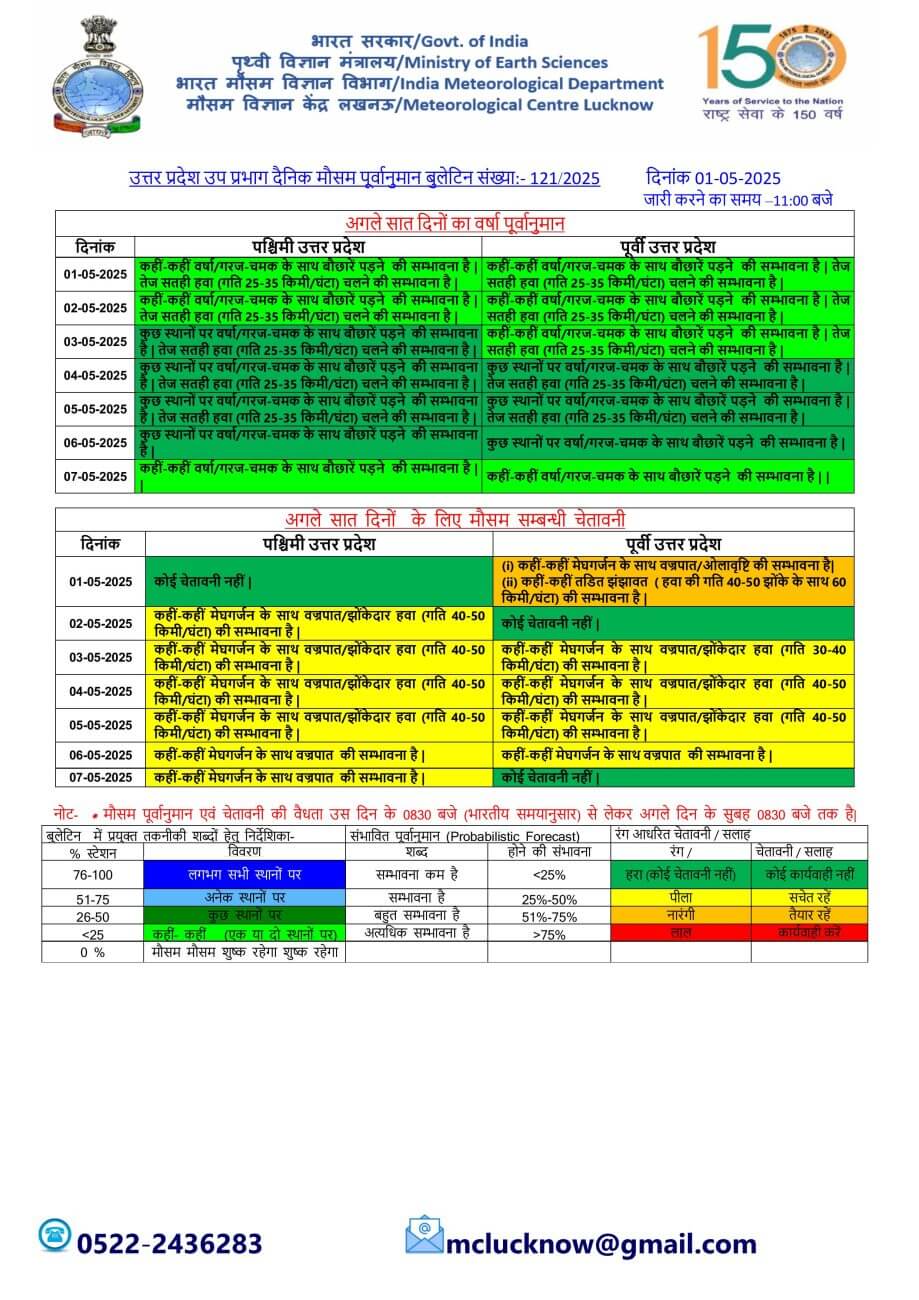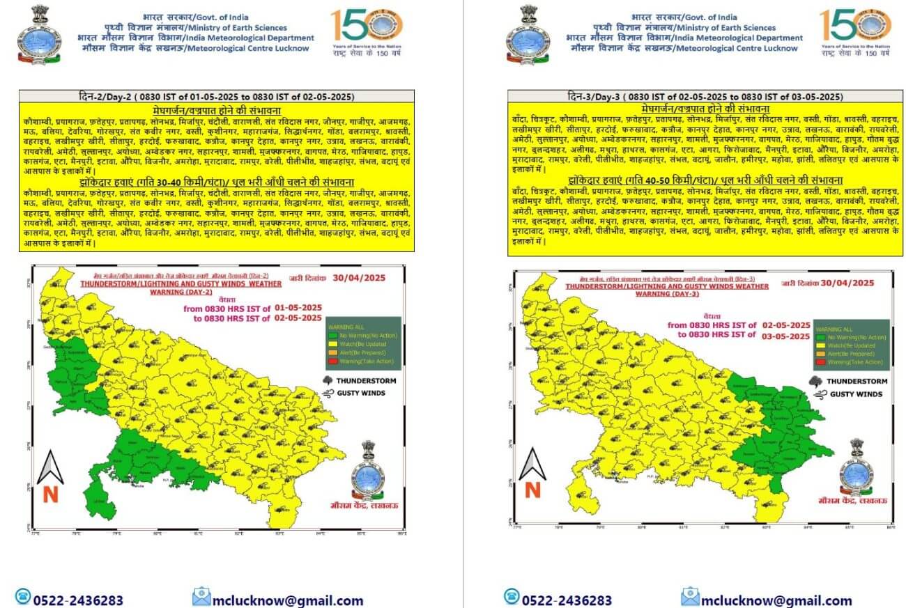 UP Weather : उत्तर प्रदेश में एक हफ्ते तक मौसम का मिजाज बिगड़ा रहेगा। मौसम विभाग ने 6 मई तक पूर्वी व पश्चिमी यूपी में बादल, बारिश और आंधी की चेतावनी जारी की है।आज गुरूवार को 35 जिलों में बारिश ,बादल गरजने व बिजली चमकने के साथ ही 30 से 40 किलोमीटर प्रति घंटा की रफ्तार से तेज झोंकेदार हवा चलने का अलर्ट जारी किया गया है।