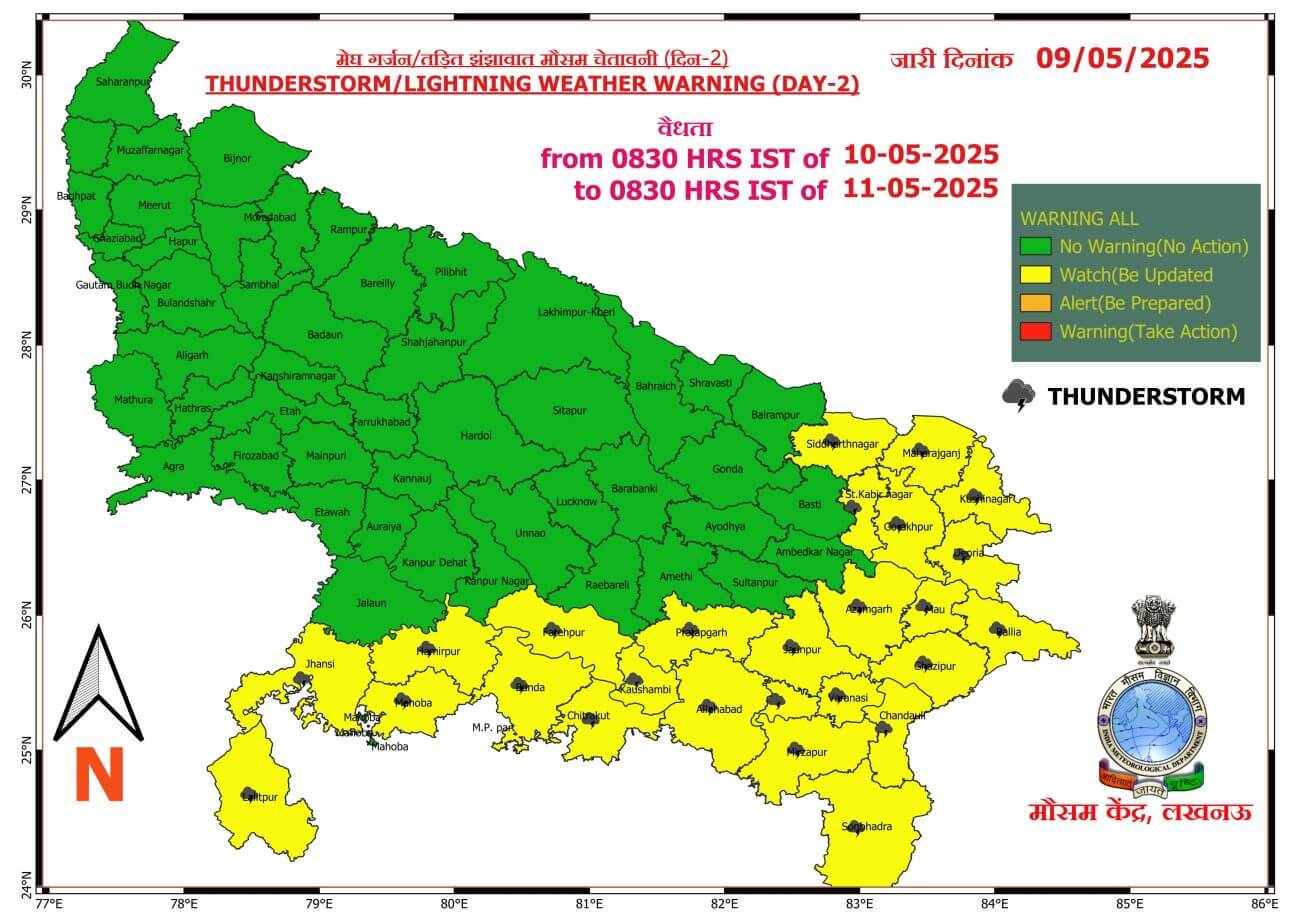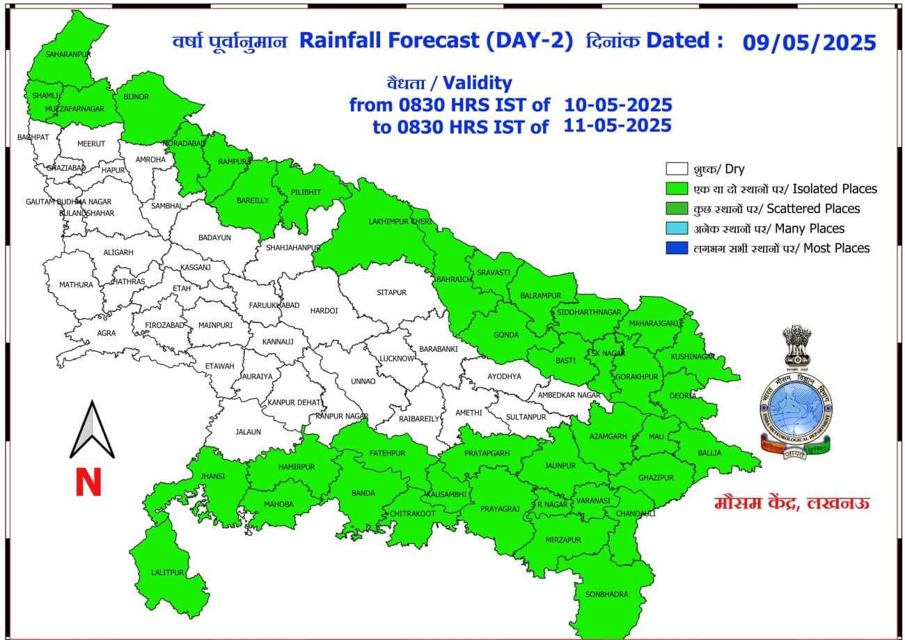 UP Weather Update : 10 मई को प्रदेश के पश्चिमी व पूर्वी हिस्से में कहीं-कहीं पर बारिश और गरज चमक के साथ बौछारें पड़ने का अनुमान है। 11 मई को पश्चिमी यूपी में मौसम साफ रहेगा लेकिन पूर्वी यूपी में कहीं-कहीं पर बादल गरजने के साथ हल्की बारिश के आसार है। 12 मई से फिर मौसम साफ होने लगेगा और तापमान में इजाफा होने लगेगा।