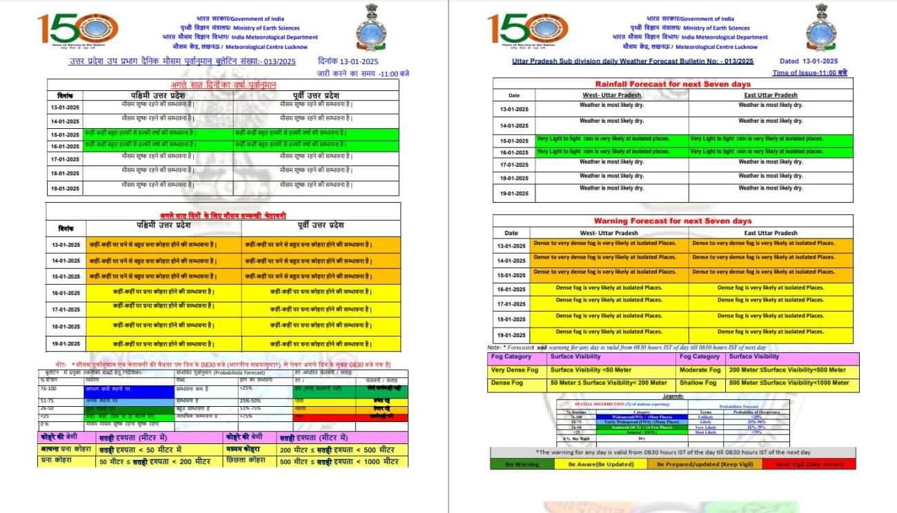 यूपी मौसम विभाग के मुताबिक, 13 व 14 जनवरी को प्रदेश में मौसम साफ और शुष्क रहेगा लेकिन प्रदेश के पश्चिमी और पूर्वी यूपी में  घने से अति घना कोहरा छाए रहने का अनुमान है। 14 जनवरी को एक पश्चिमी विक्षोभ सक्रिय होगा, जिसके प्रभाव से 15-16 जनवरी को प्रदेश में बादल बारिश की संभावना है। 24 घंटे में अधिकतम तापमान में 2 से 4 डिग्री सेल्सियस तक उछाल तो 48 घंटे में न्यूनतम तापमान में थोड़ी कमी के आसार हैं।