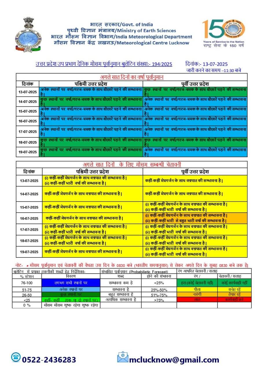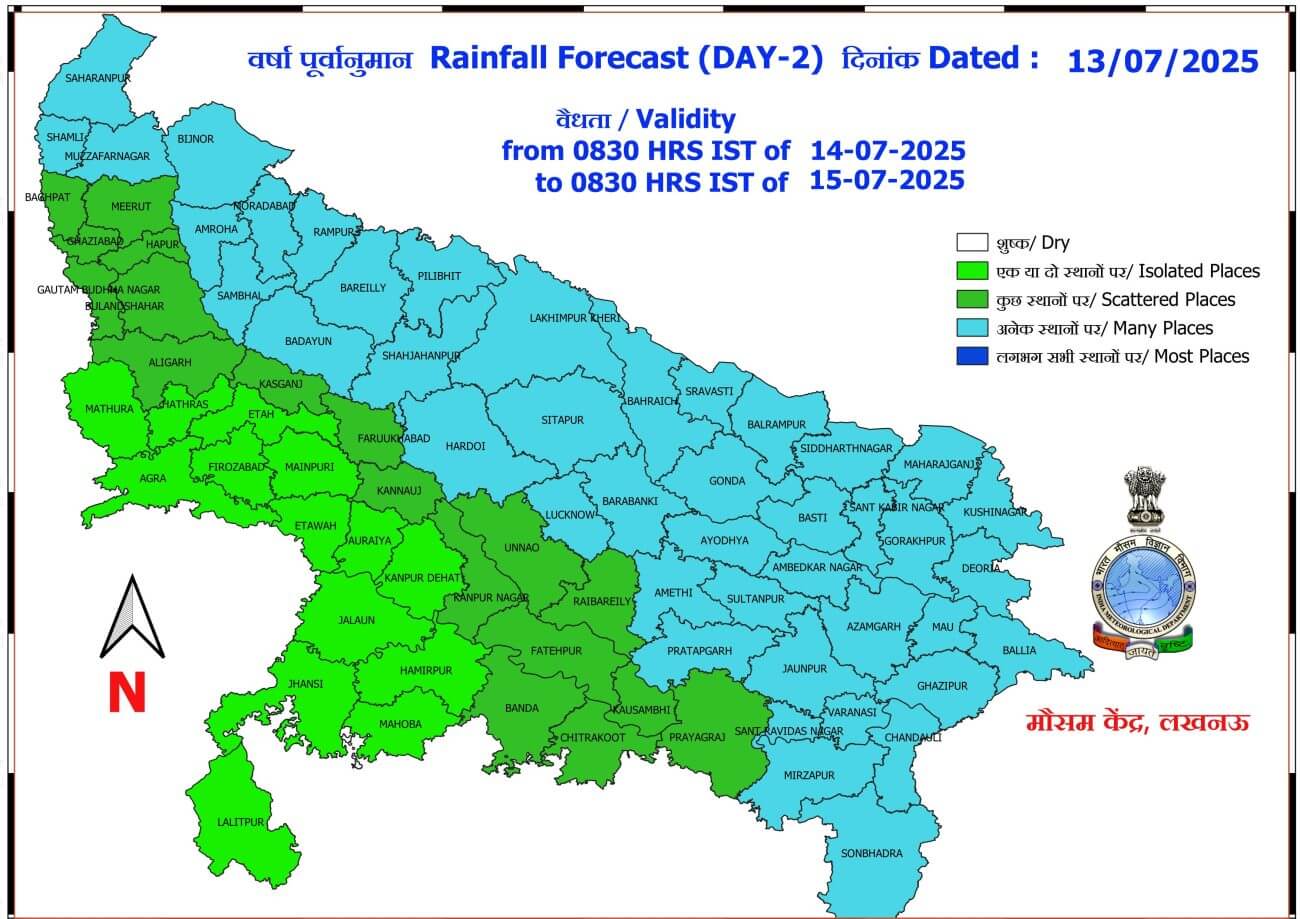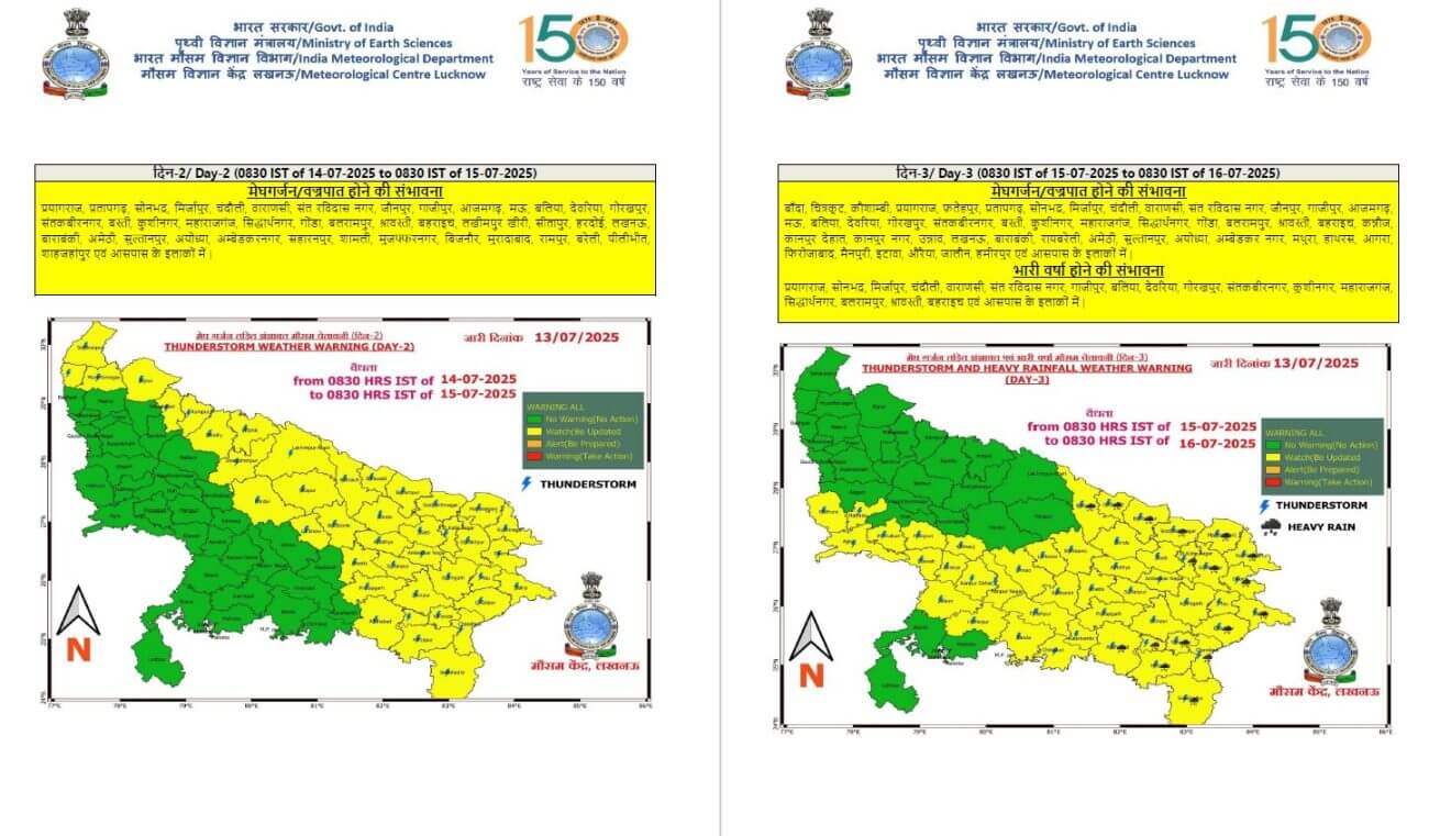 - 14-07-2025: पश्चिमी में कुछ / पूर्वी यूपी में अनेक स्थानों पर वर्षा/गरज-चमक के साथ बौछारें ।कहीं-कहीं भारी वर्षा/ मेघगर्जन के साथ वज्रपात।