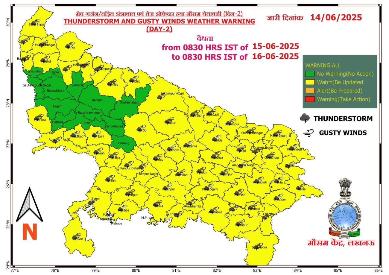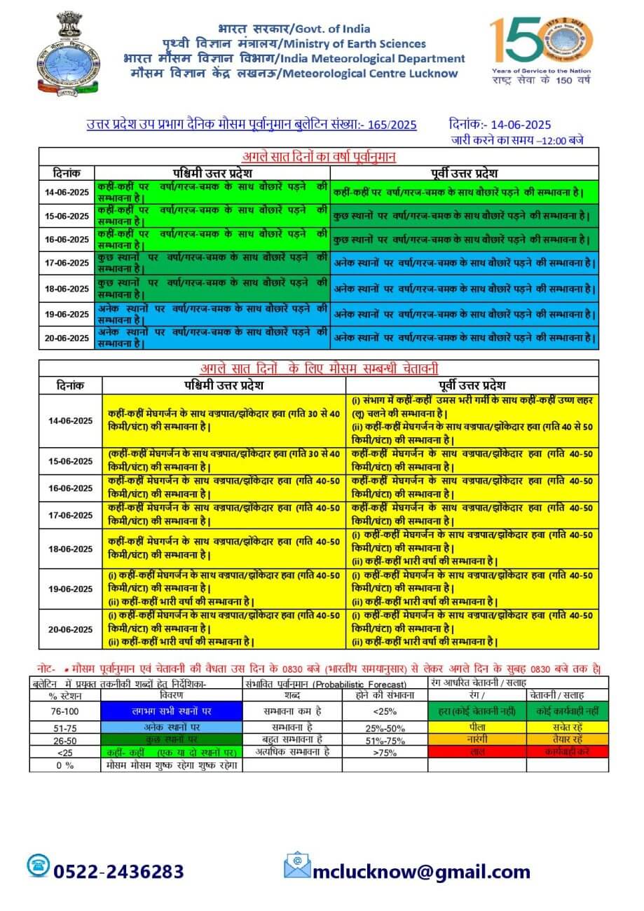 14 जून के बाद से लू की स्थितियों में स्पष्ट रूप से कमी आने की संभावना है ।15-16 जून को पूर्वी और पश्चिमी यूपी में बारिश के साथ ही मेघगर्जन, वज्रपात और 40 से 50 किमी प्रति घंटे की रफ्तार से हवाएं चलने का येलो अलर्ट जारी किया गया है। 17- 18 जून को पूरे यूपी में आंधी-बारिश की संभावना जताई गई है। 17 जून से पूर्वी उत्तर प्रदेश में और 19 जून से पश्चिमी उत्तर प्रदेश में भारी बारिश की संभावना है।