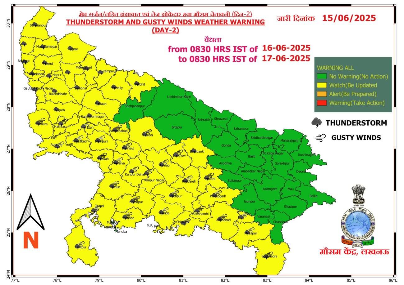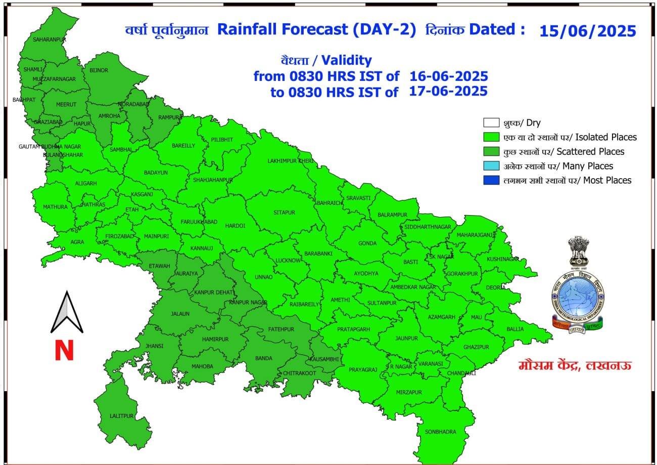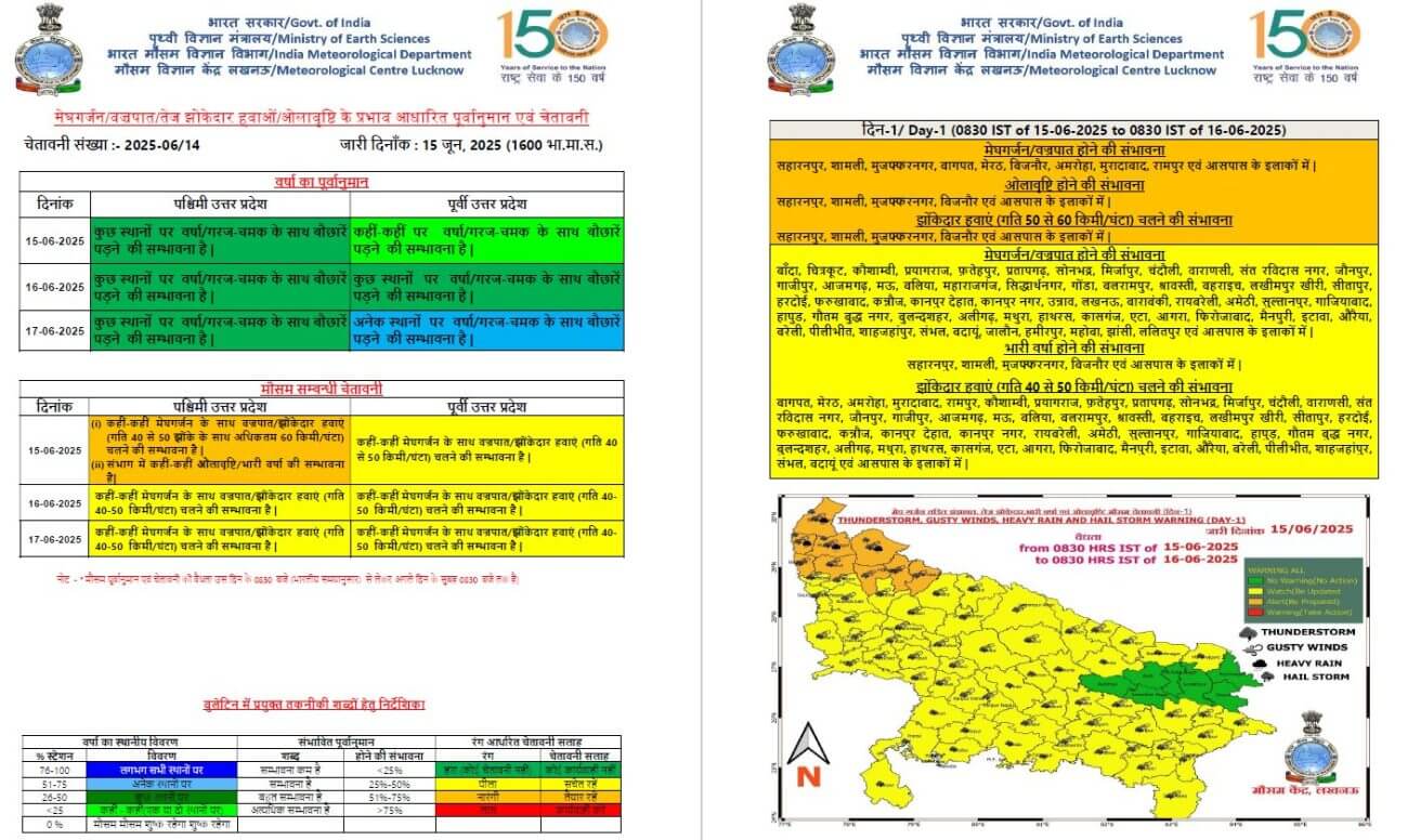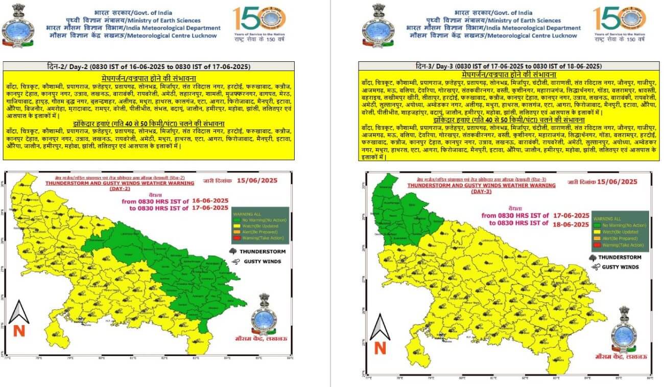 यूपी मौसम विभाग की मानें तो 17 से 20 जून के बीच मानसून पूर्व गतिविधियों में तेजी आएगी और प्रदेश के अधिकांश हिस्सों में मध्यम से भारी बारिश होने की संभावना है। । खास करके 18 जून से मेघगर्जन वज्रपात के साथ भारी वर्षा का दौर शुरू हो सकता है। आगामी 3-4 दिनों के दौरान तापमान में 3 से 5 डिग्री सेल्सियस तक की गिरावट संभव है, जिससे ताप सूचकांक में भी कमी आएगी।