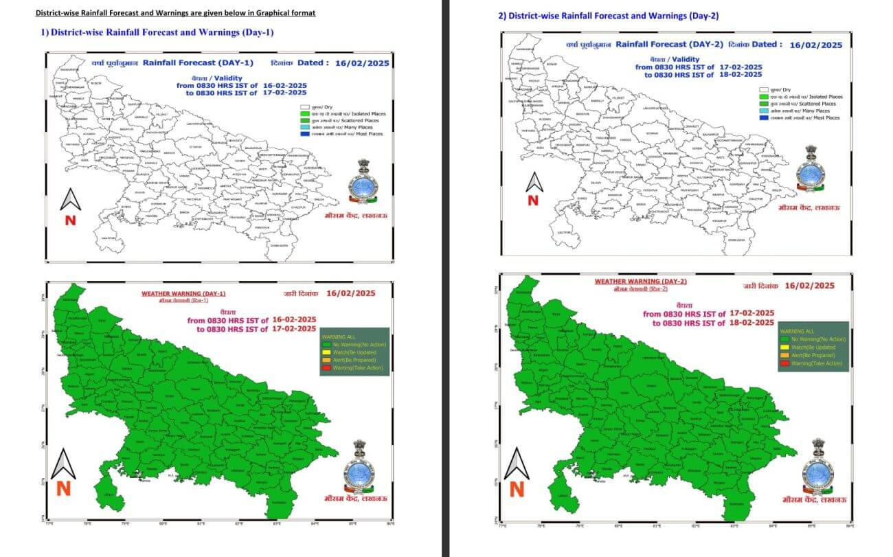 - 17 फरवरी को पश्चिमी व पूर्वी यूपी में मौसम शुष्क रह सकता है। प्रदेश के दोनों हिस्सों में देर रात और सुबह के समय कहीं-कहीं पर छिछला कोहरा छाने की संभावना है।