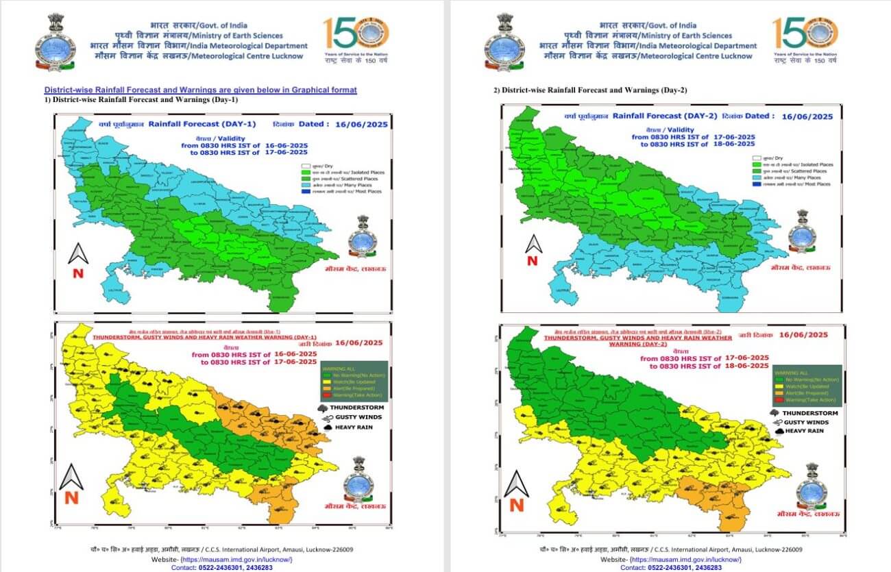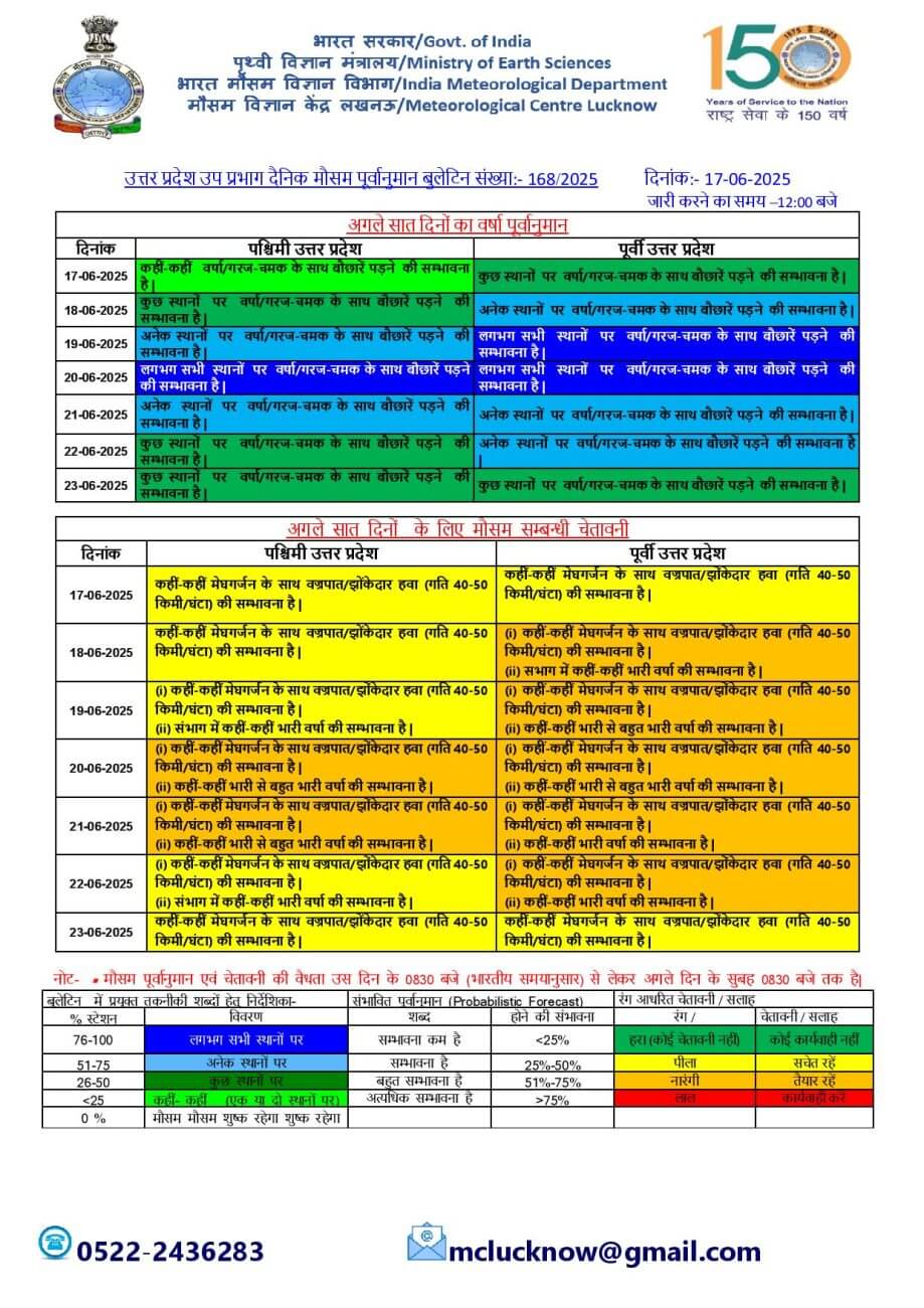 आज मंगलवार 17 जून को प्रदेश के पश्चिमी और पूर्वी हिस्से में कुछ स्थानों पर बारिश और गरज चमक के साथ बौछारें पड़ने की संभावना है। इस दौरान दोनों हिस्सों में बादल गरजने एवं बिजली चमकने के साथ ही 40 से 50 किलोमीटर प्रति घंटा की रफ्तार से झोंकेदार हवा चल सकती है।पूर्वी यूपी में कहीं-कहीं पर भारी बारिश भी होने का अनुमान है।