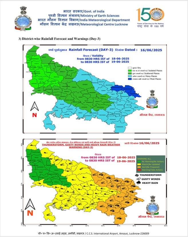 यूपी मौसम विभाग की मानें तो 18 से 20 जून के बीच दक्षिण पश्चिमी मानसून की गतिविधियों में तेजी आएगी और प्रदेश के अधिकांश हिस्सों में मध्यम से भारी बारिश होने की संभावना है। । खास करके 18 जून से मेघगर्जन वज्रपात के साथ भारी वर्षा का दौर शुरू हो सकता है।।प्रदेश में भारी बारिश के साथ 19-21 जून के दौरान कहीं-कहीं बहुत भारी बारिश होने की संभावना है। 20 से 22 जून तक प्रदेश गरज-चमक के साथ तेज बारिश की संभावना बनी रहेगी। अगले 3 दिनों के दौरान अधिकतम तापमान में 4-6 डिग्री सेल्सियस और 3-4 दिनों के दौरान न्यूनतम तापमान में 3-5 डिग्री सेल्सियस की क्रमिक गिरावट होने की संभावना है। इसके बाद कोई बड़ा परिवर्तन नहीं होगा।