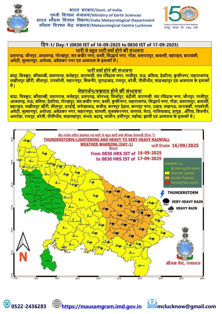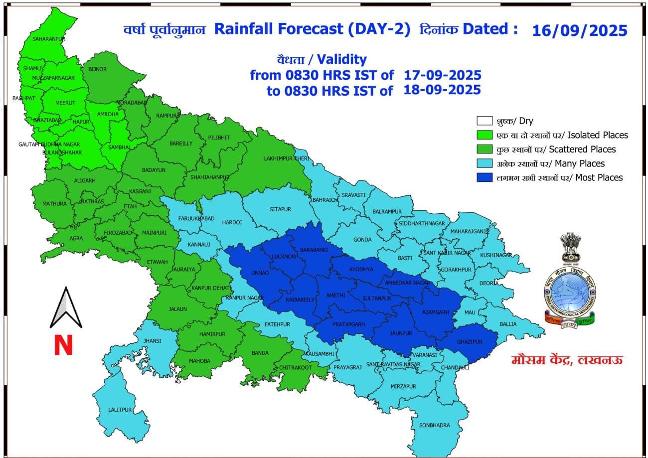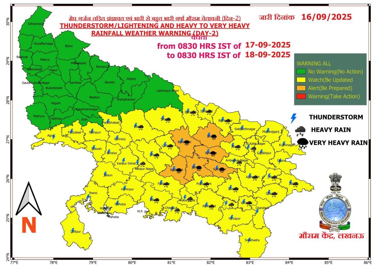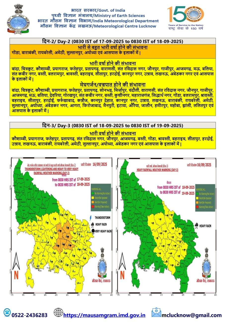 • 17-09-2025: पश्चिमी में कुछ / पूर्वी यूपी में अनेक स्थानों पर वर्षा/गरज-चमक के साथ बौछारें ।दोनों हिस्सों में कहीं कहीं भारी वर्षा, मेघगर्जन, वज्रपात