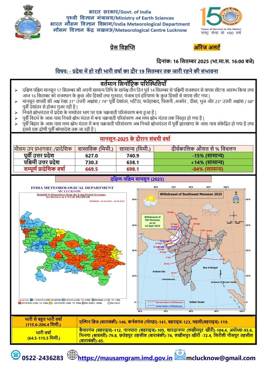 दक्षिण पश्चिम मानसून 17 सितम्बर की अपनी सामान्य तिथि के सापेक्ष तीन दिन पूर्व 14 सितम्बर से पश्चिमी राजस्थान से वापस लौटना आरम्भ किया तथा 16 सितम्बर को राजस्थान के कुछ और हिस्सों तथा गुजरात, पंजाब एवं हरियाणा के कुछ हिस्सों से वापस लौट गया | मानसून वापसी की अक्ष रेखा 31° उत्तरी अक्षांश / 74° पूर्वी देशांतर, भटिंडा, फतेहाबाद, पिलानी, अजमेर, दीसा, भुज और 23° उत्तरी अक्षांश / 68° पूर्वी देशांतर से होकर गुजर रही है। निचले क्षोभमंडल में प्रदेश के मध्योत्तर भाग पर एक चक्रवाती परिसंचरण बना हुआ है । पूर्वी विदर्भ के आस-पास निचले क्षोभ मंडल में बना चक्रवाती परिसंचरण अब मध्य क्षोभ मंडल तक विस्तृत हो गया है। पूर्वी बिहार के आस-पास मध्य क्षोभ मंडल में बना चक्रवाती परिसंचरण अब निचले क्षोभमंडल में पूर्वी झारखण्ड के आस-पास संकेद्रित हो गया है तथा इससे एक द्रोणी पूर्वी बांग्लादेश तक जा रही है। इसके असर से – प्रदेश में हो रही भारी वर्षा का दौर 19 सितम्बर तक जारी रहने की संभावना है।पूरे यूपी में अबतक 669.5 मिमी वर्षा हुई है। इसमें पूर्वी उत्तर प्रदेश 627.0 और पश्चिमी उत्तर प्रदेश 638.1 मिमी वर्षा हुई है।