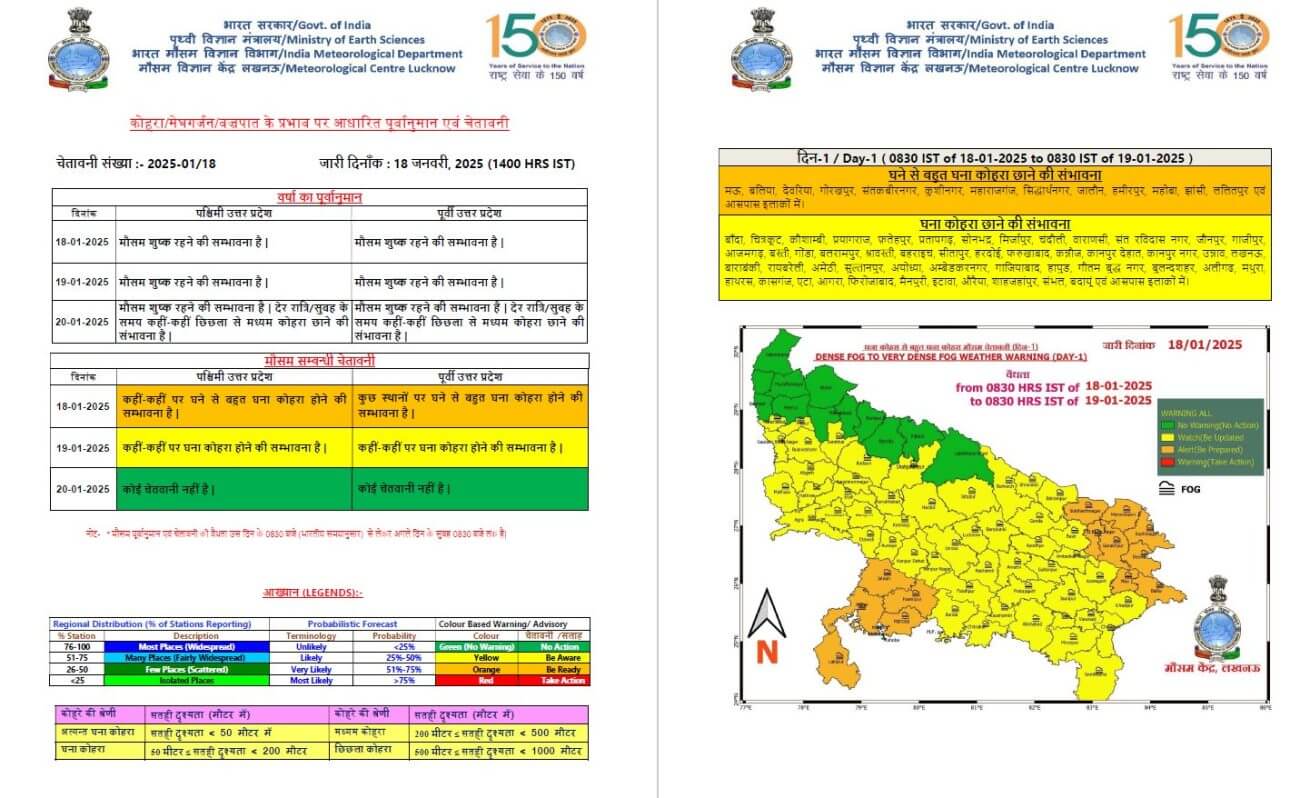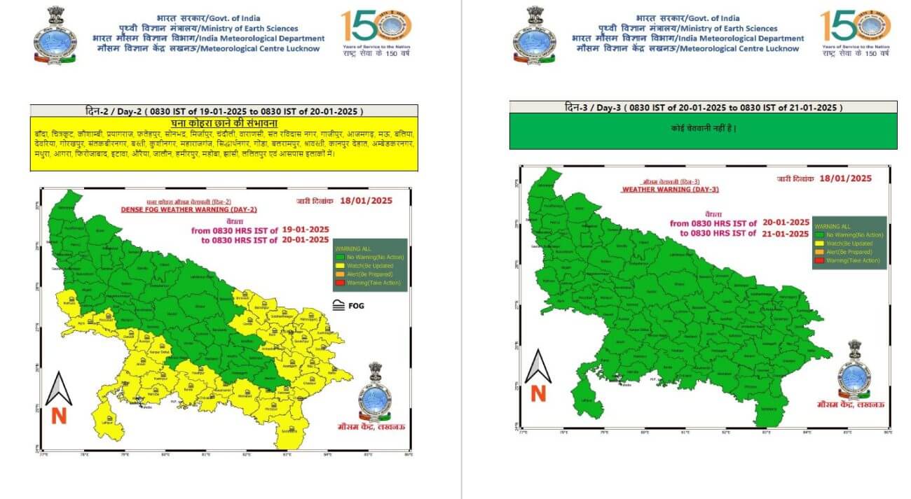 UP Weather Alert Today : उत्तर प्रदेश में सोमवार के बाद नए पश्चिमी विक्षोभ के असर से फिर बादल बरिश और ओले की स्थिति बनेगी,इससे पहले रविवार सोमवार को प्रदेश का मौसम शुष्क रहेगा लेकिन बर्फीली हवाओं के चलते 19 जनवरी को पश्चिमी और पूर्वी उत्तर प्रदेश के 45 जिलों में गलन भरी पछुआ हवा और घने कोहरे का अलर्ट जारी किया गया है।तापमान में भी तीन डिग्री सेल्सियस तक गिरावट आ सकती है।