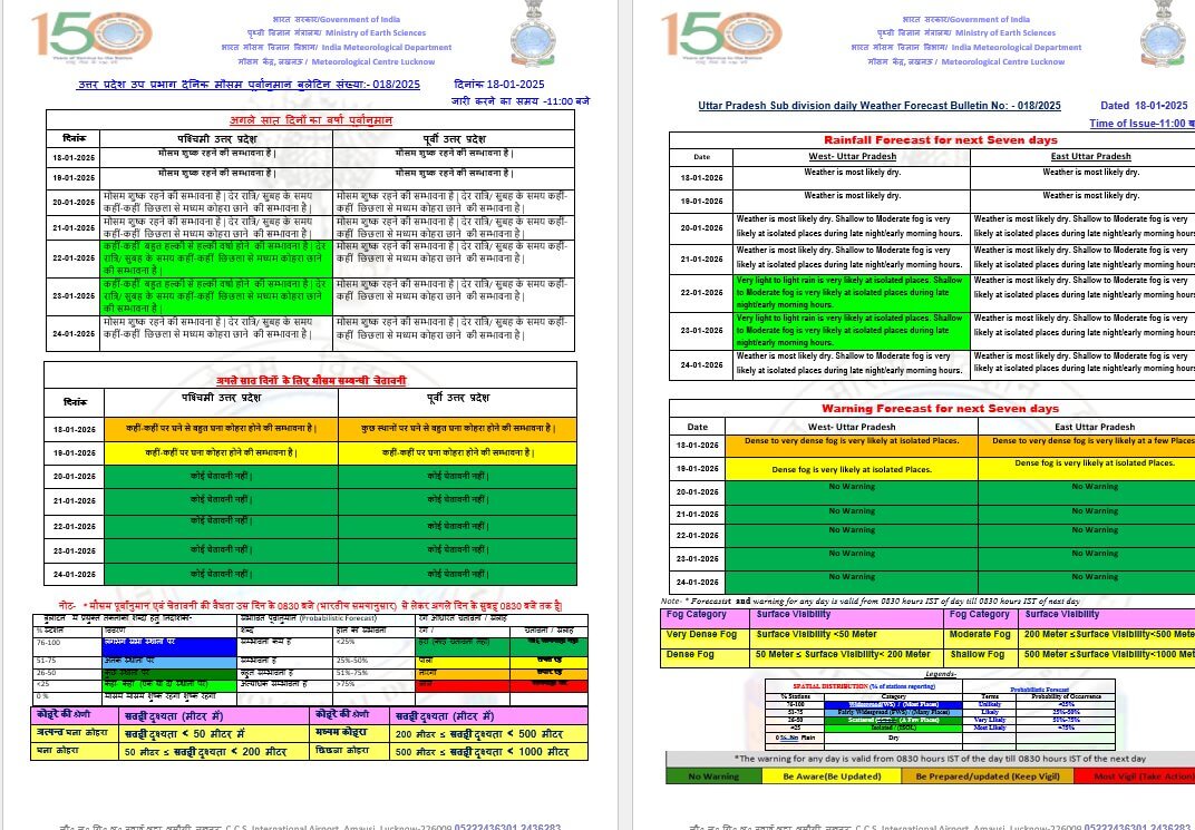 यूपी मौसम विभाग के मुताबिक, तीन दिनों तक कुछ स्थानों पर घना तो कुछ स्थानों पर आति घना कोहरा छाया रहेगा। 21 से 23 जनवरी तक पश्चिमी उत्तर प्रदेश में गरज चमक के साथ हल्की बारिश हो सकती है, पूर्वी उत्तर प्रदेश में कहीं कहीं बूंदाबांदी हो सकती है।आज रविवार को लखनऊ में सुबह-शाम कोहरा छाया रहेगा अधिकतम तापमान 19 व न्यूनतम तापमान 9 डिग्री सेल्सियस रहने की संभावना है।