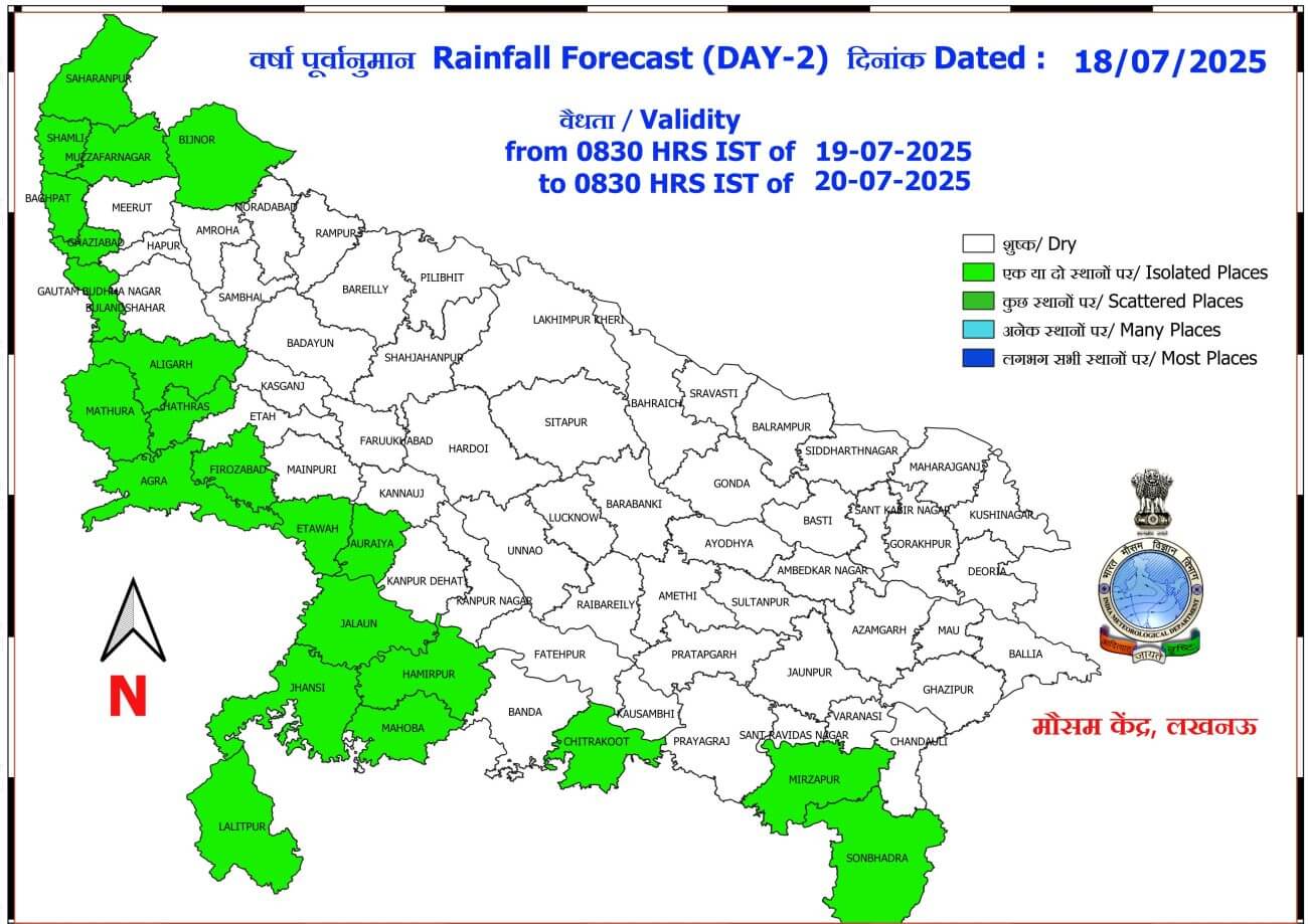 - 19-07-2025: पश्चिमी में कुछ/ पूर्वी यूपी में अनेक स्थानों पर वर्षा/गरज-चमक के साथ बौछारें ।