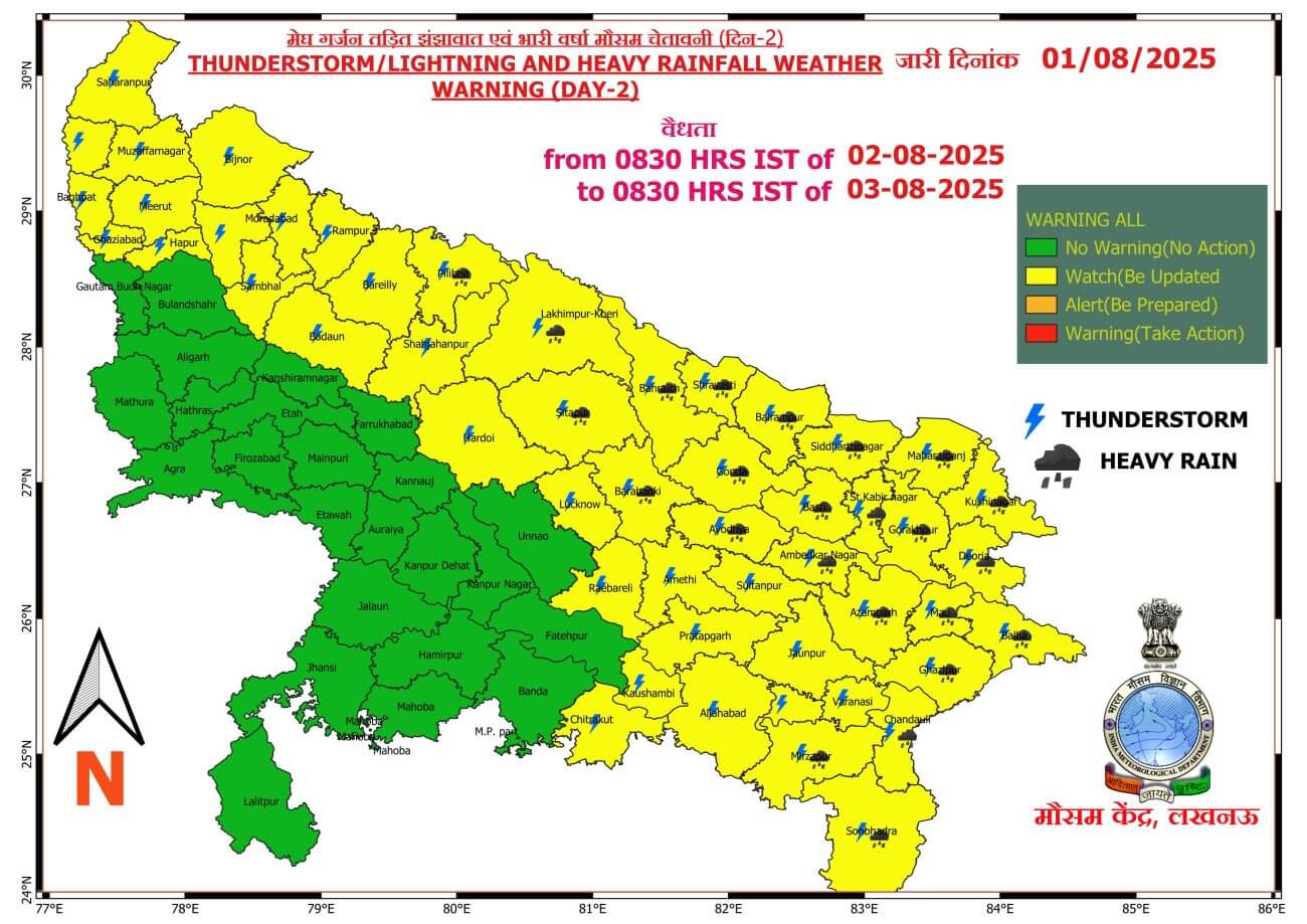 - 3-08-2025: पश्चिमी में कुछ / पूर्वी यूपी में अनेक स्थानों पर वर्षा/गरज-चमक के साथ बौछारें ।कहीं कहीं भारी बारिश मेघगर्जन और वज्रपात के आसार।