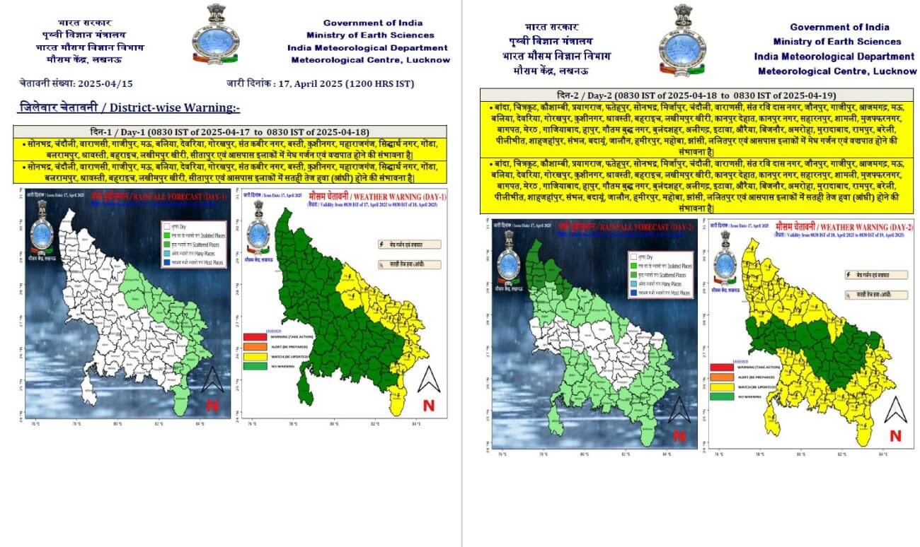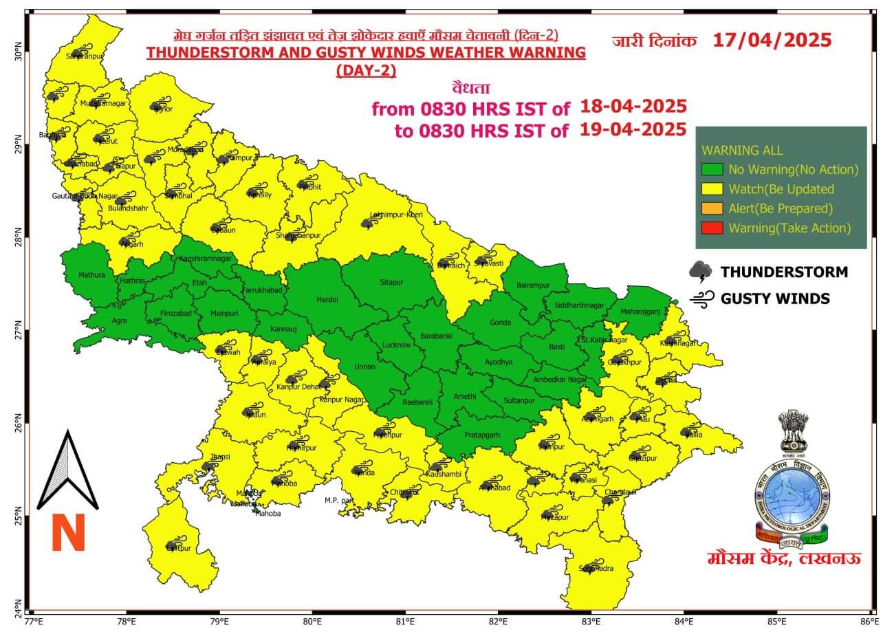 यूपी मौसम विभाग ने 18 अप्रैल को प्रदेश के पश्चिमी व पूर्वी हिस्से में गरज चमक के साथ बारिश, बादल गरजने व बिजली चमकने और 40 से 50 किमी प्रति घंटा की रफ्तार से झोंकेदार हवा चलने चलेगी। 19 और 20 अप्रैल को प्रदेश के दोनों हिस्सों में कहीं-कहीं पर बारिश होगी। इस दौरान दोनों हिस्सों में 30 से 40 किमी प्रति घंटा की रफ्तार से तेज हवा चल सकती है। 21-22 अप्रैल से मौसम फिर से साफ होने के आसार हैं।